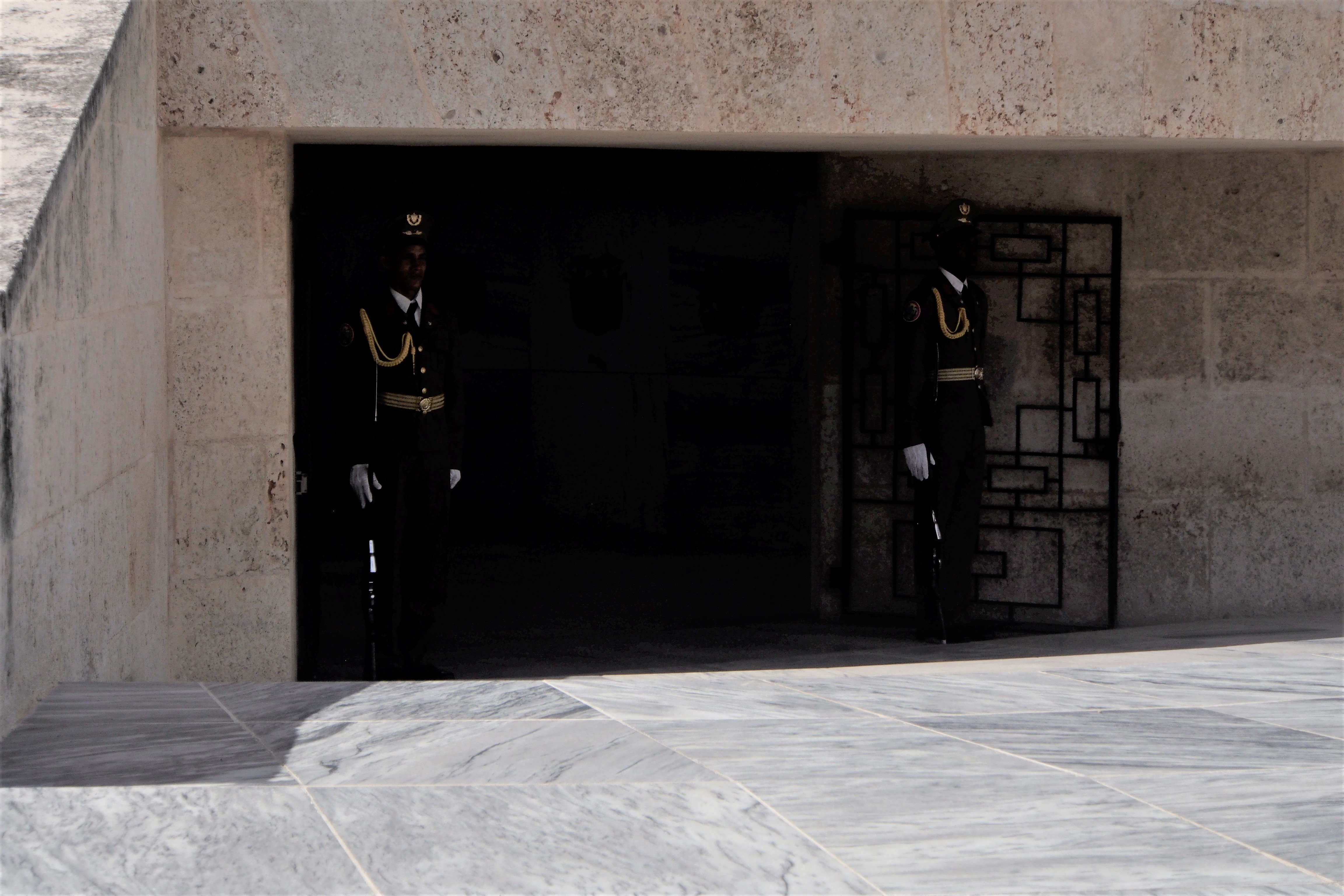 下层里面放着卡斯特罗的用国旗包裹的骨灰盒,门外有卫兵把守,禁止游人入内,