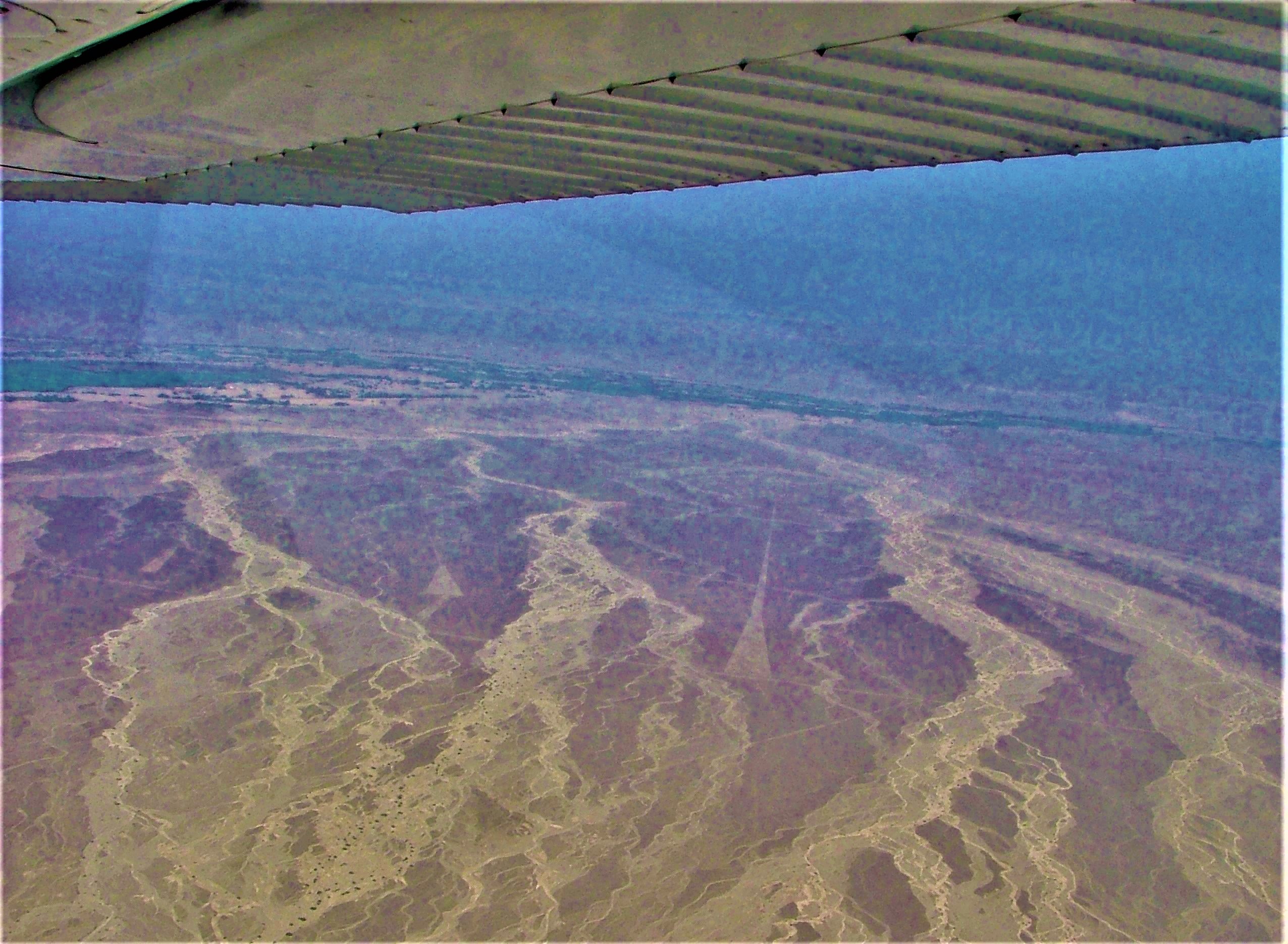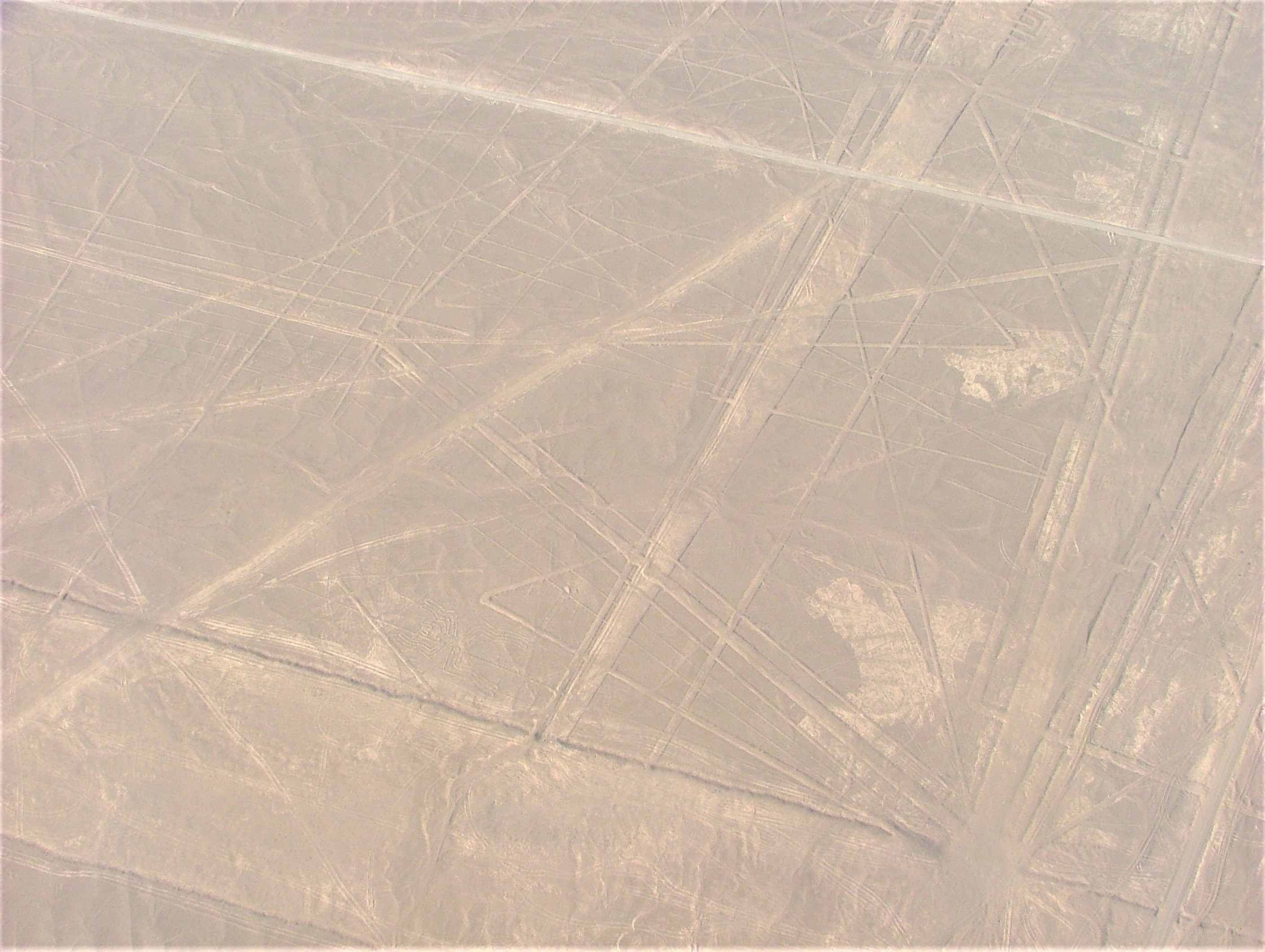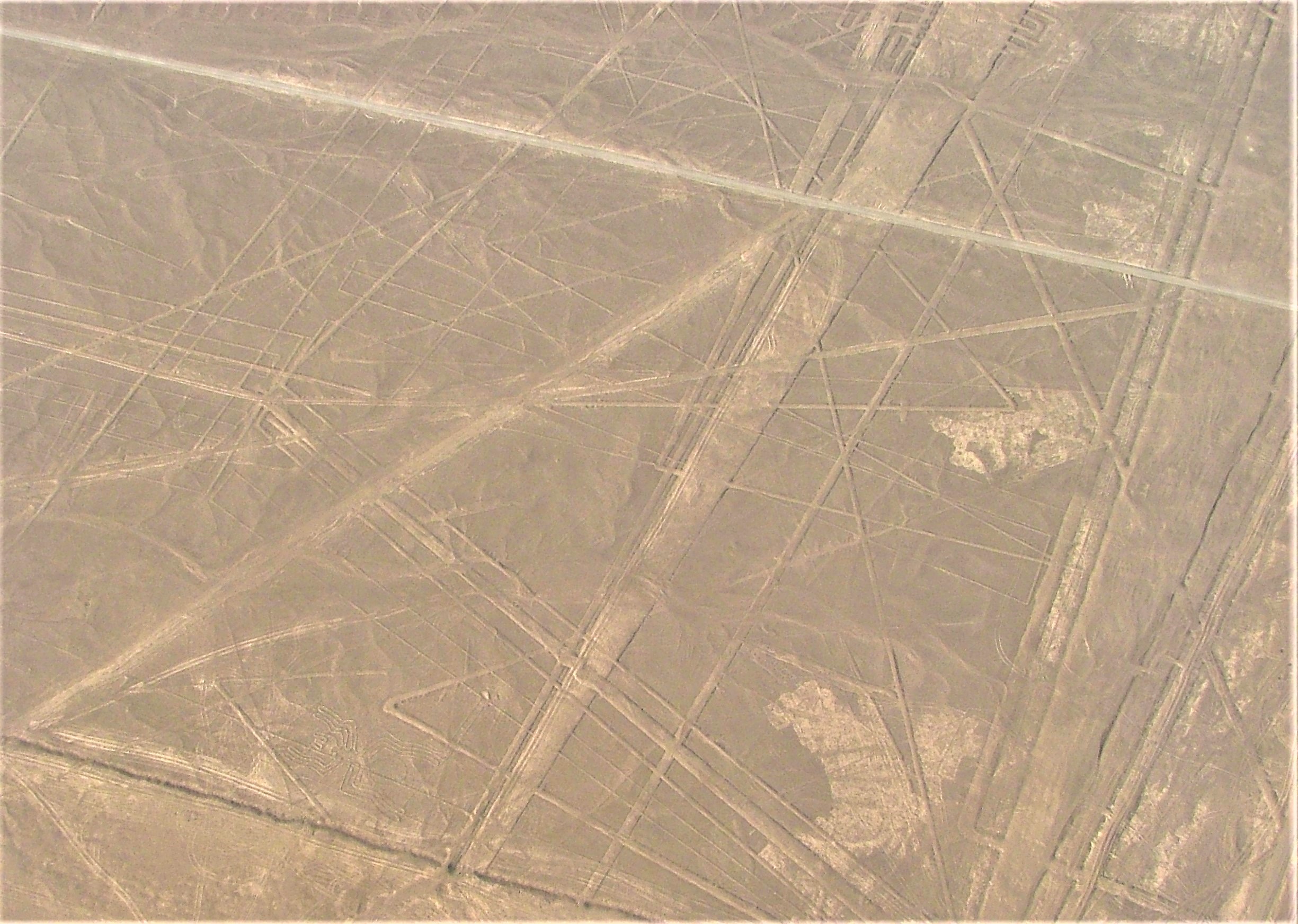 很快就飞到景点上空,首先看到的是直角相连的两条直线,飞行员介绍看到的这些笔直的纳斯卡线条产生于公元前200年到公元后300年。它们已经静静地躺在那儿两千多年了。这些线条、图案都是怎么制作出来的呢?真的令人惊叹。