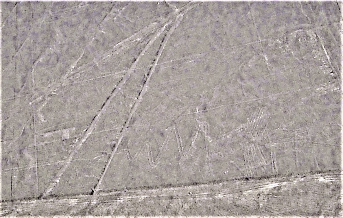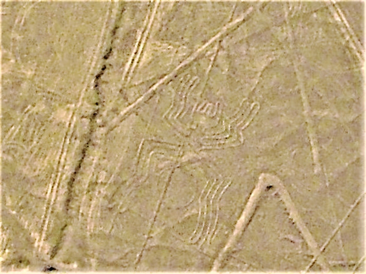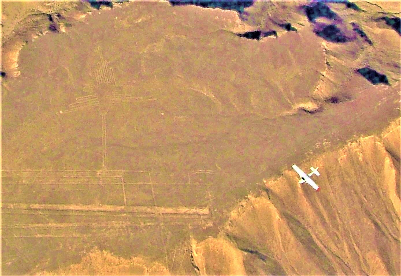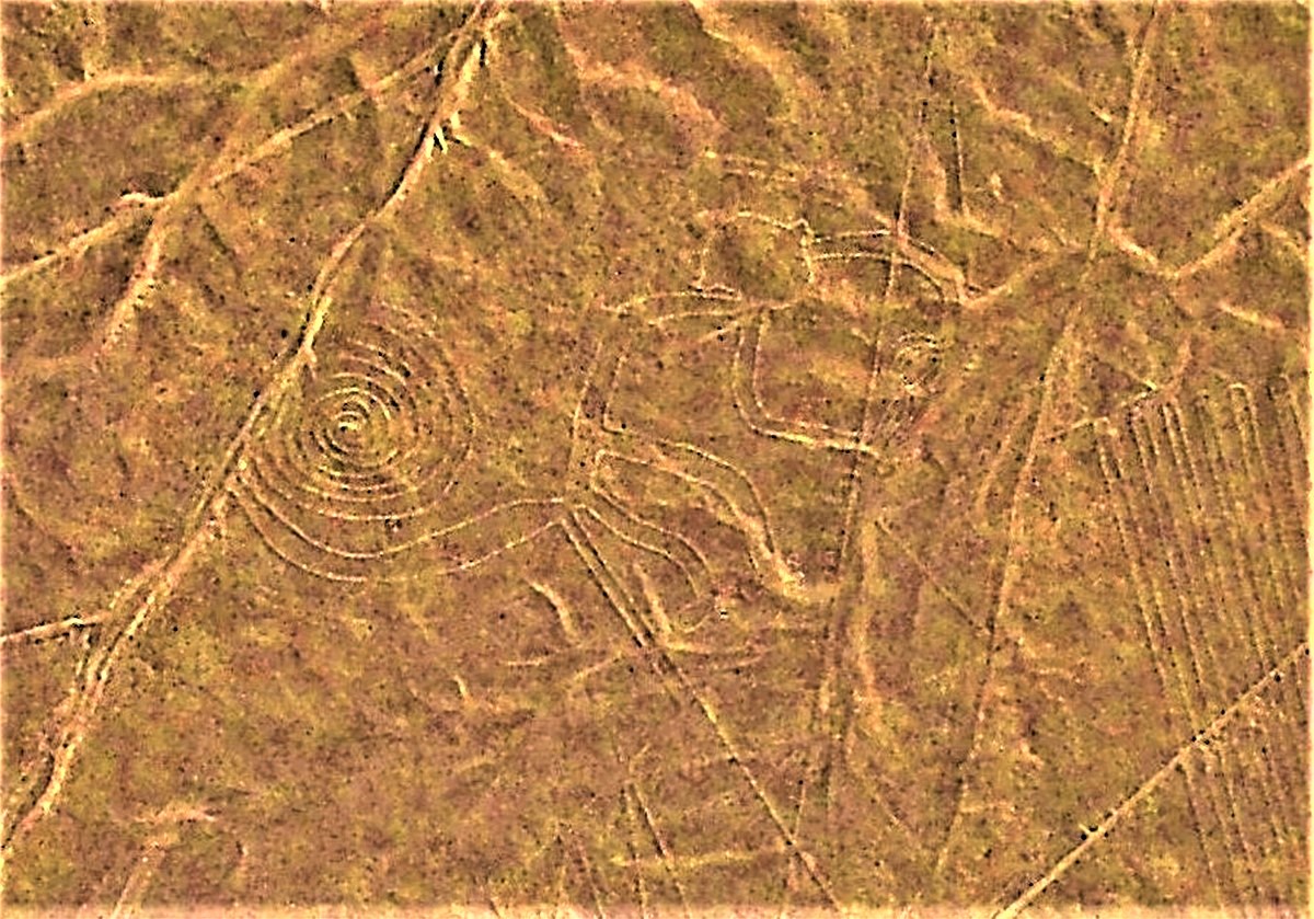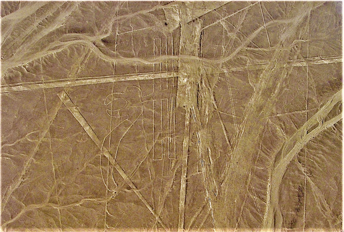 往前飞不远,驾驶飞机兼导游,在天上打起转转,指着下说,快看猴子。哇,太让人惊叹了只见地上清清楚楚的看到一只卷尾吧的猴的图像,太不可思议了,在那个时代,如此次大范围画出一只神灵活现卷尾猴,是怎么做到的,导游说,在地上根本看不到有猴子的图形,这更增加了,这里对看到这地画神秘感,