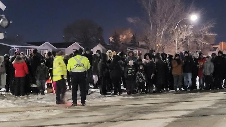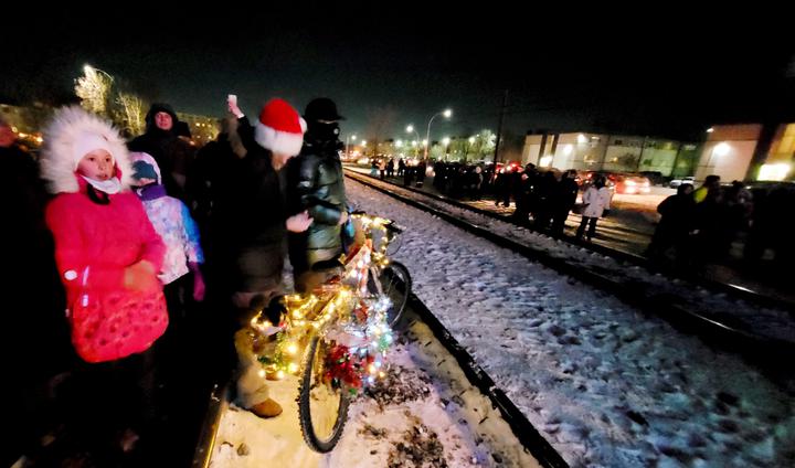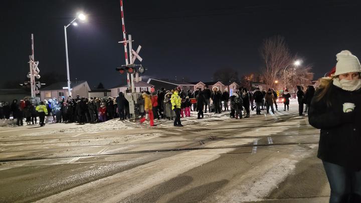 温尼泊的市民也陆陆续续到达。数以千计的市民井然有序,在警察叔叔的指挥下,按照到达的先后顺序排列在火车道旁的桅杆两侧。随着一声鸣笛,长约1,000英尺,连载着14节装饰着灯光和饰品的车厢的加拿大太平洋假日火车,