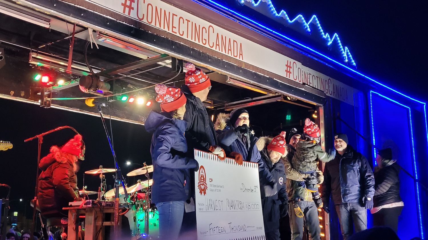 零下24度的寒冷,依然挡不住人们久违的热情,人们欢呼着、跳跃着,伴随着音乐舞动着高歌着。时隔两年,这辆加拿大太平洋假日火车(CP Holiday Train)终于再次回归为当地的食物银行筹集资金和食物,同时奉献现场音乐表演,今年到达温尼泊火车站的时间是12月3日晚8:45,