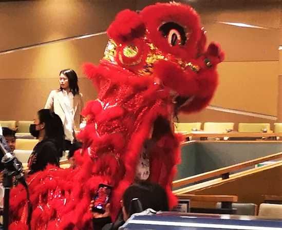 而摇头晃脑的雄狮在观众席间飞奔跳跃,引起阵阵欢呼,激励大家在新的一年中振作精神,大展宏图!