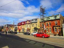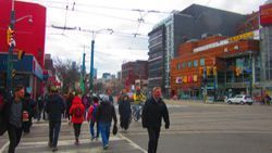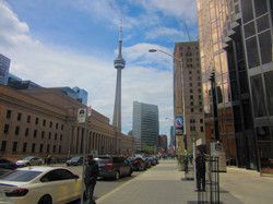 远处的多伦多电视塔的塔尖,从市中心高高的群楼,伸出头来,站在塔里的游客们,肯定在那里欣赏着这里拥挤的汽车,穿梭的车辆和街上来回穿梭的人群,