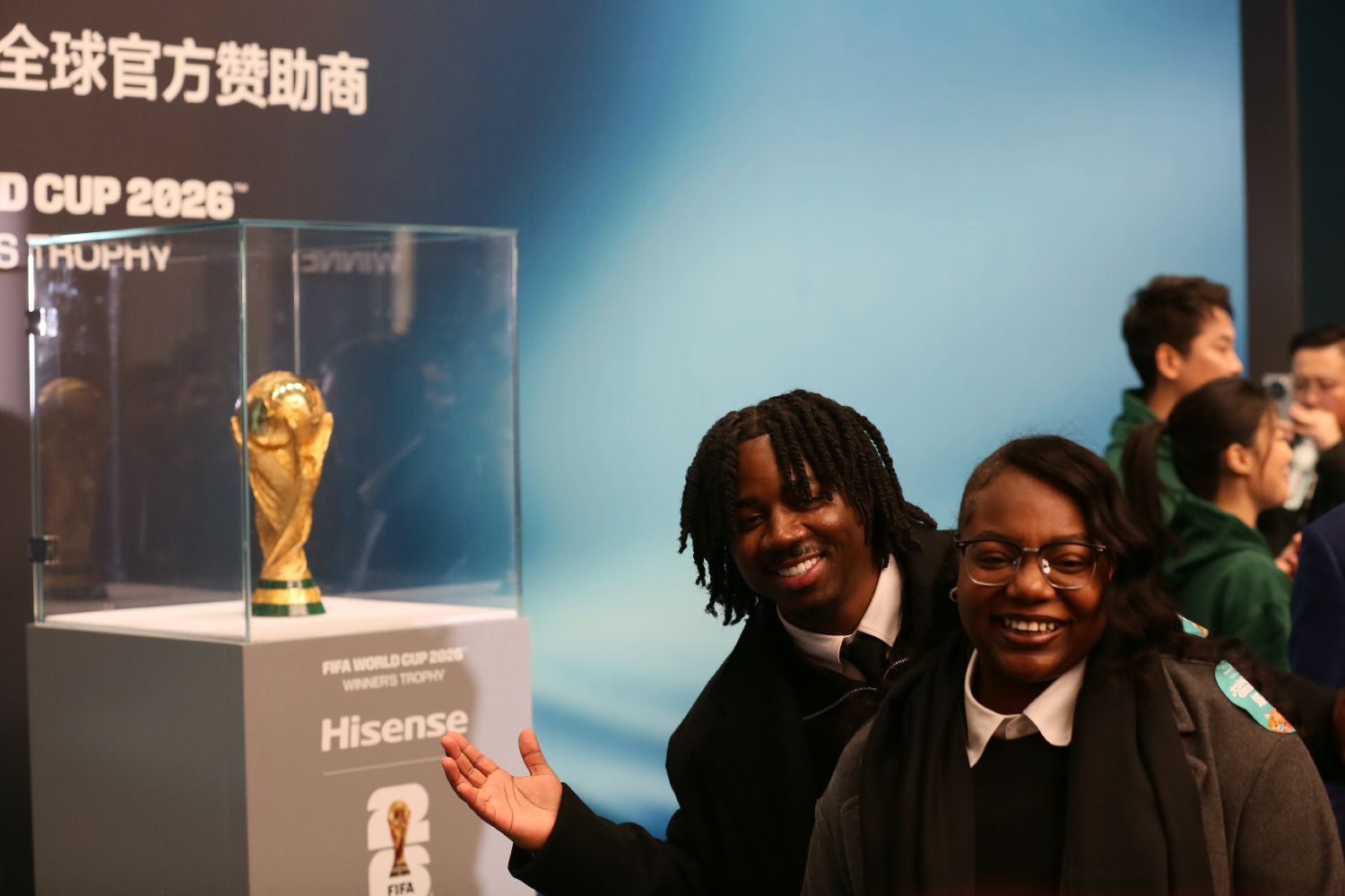 12月21日,国际足联世界杯的冠军奖杯——大力神杯首次亮相山东青岛奥帆中心,并向公众开放免费参观。图为游客与大力神杯合影。(图片来源:中新社)