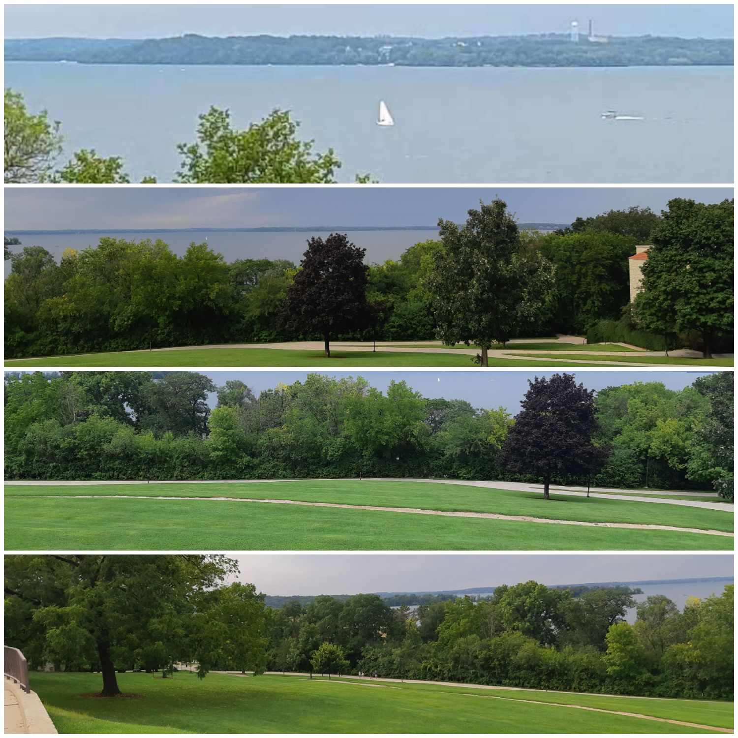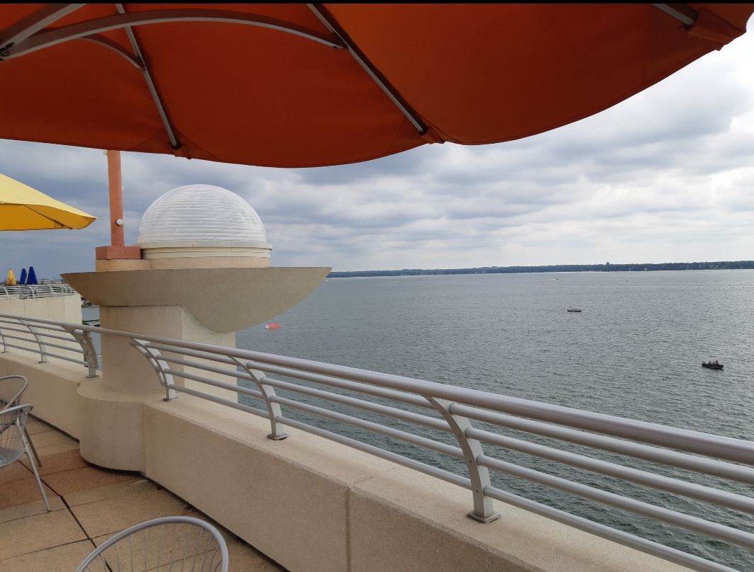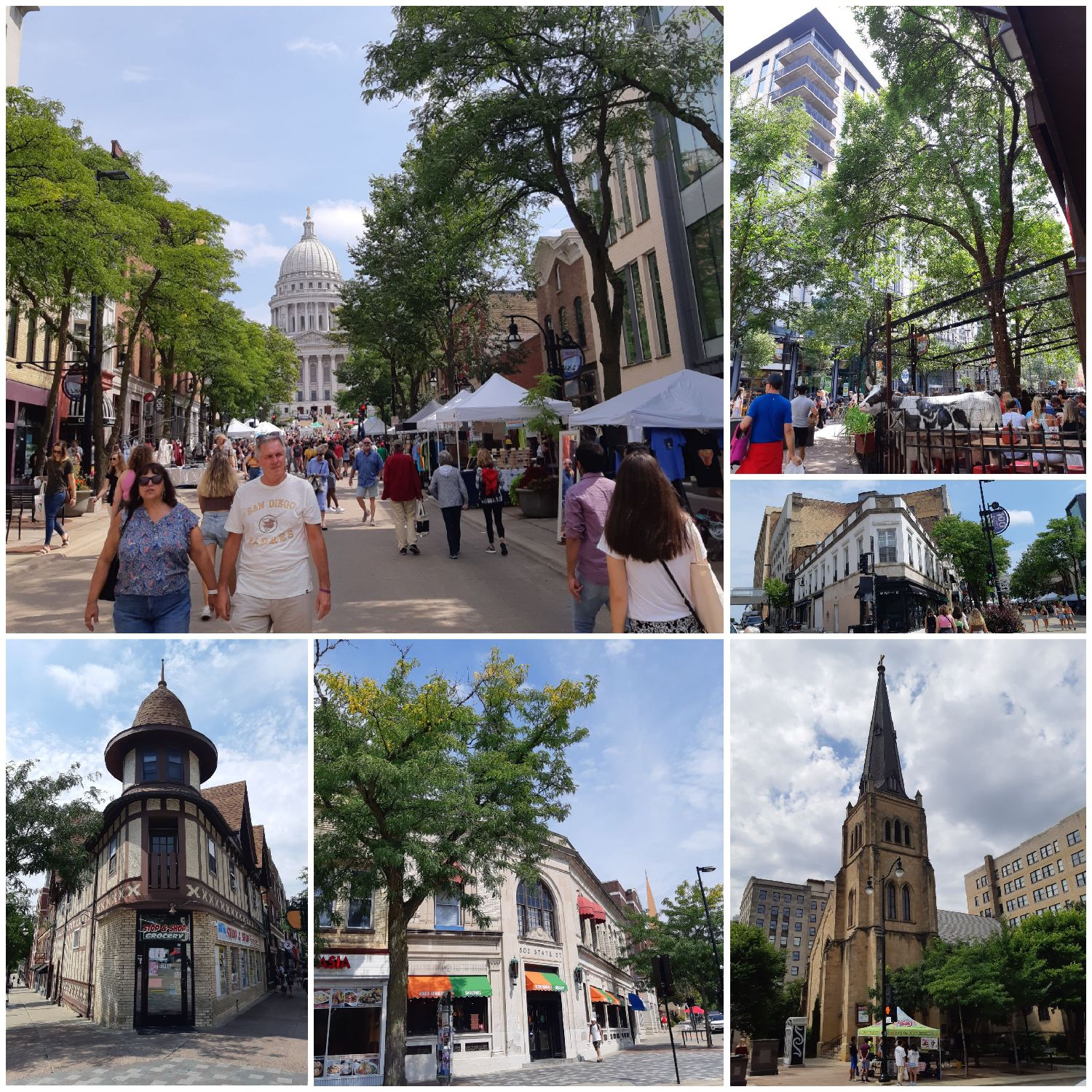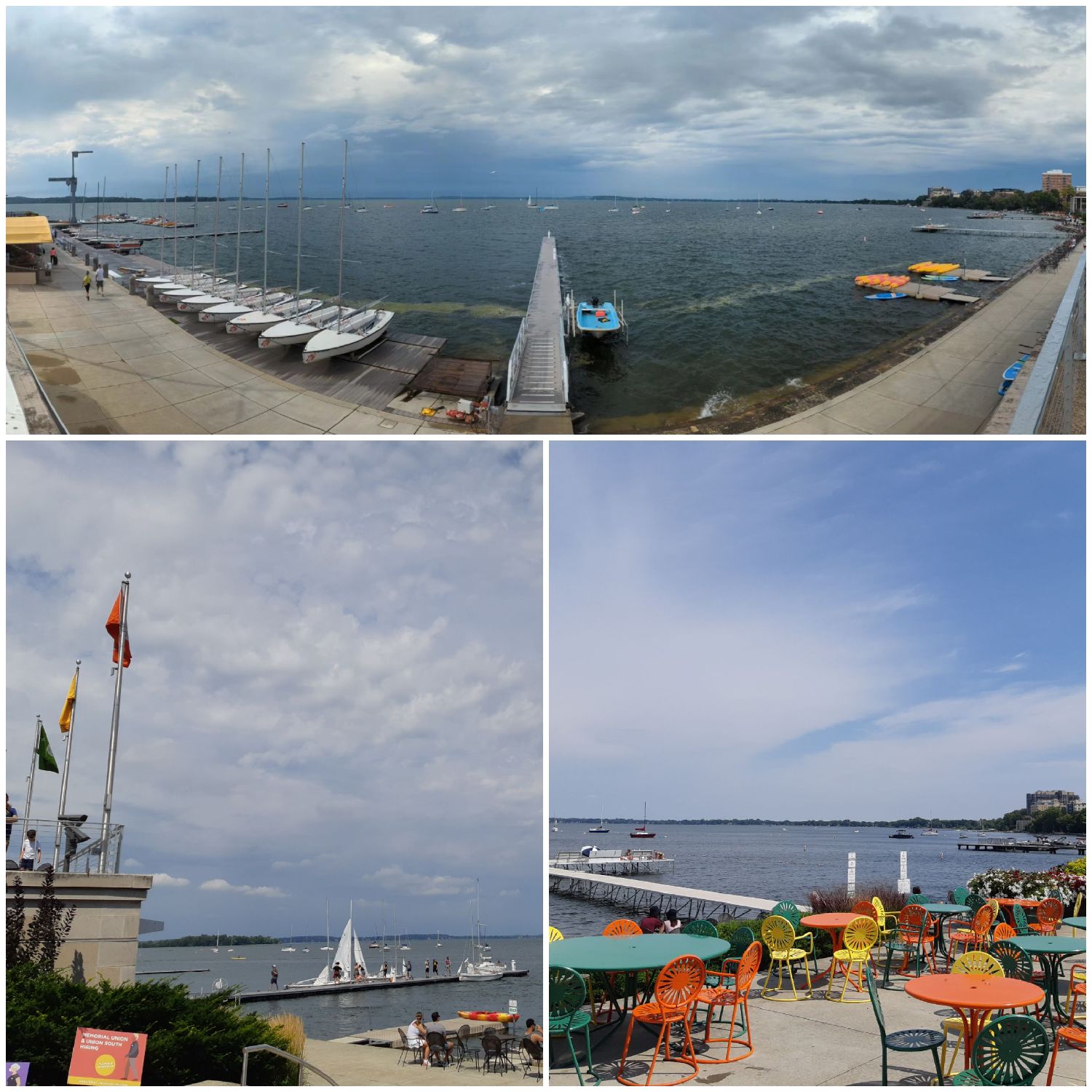 我们到访时的八月底,正值每逢周六的市集日,州议会大厦前的市集上,摊位林立,不仅有农民们出售新鲜自产农产品,更有卖各色手工产品的,拉圈子杂耍的,用自己发明的不知名乐器演奏音乐的,热闹非凡。台阶上,两位上身裸露的女子高举牌子,写着“Abortion is normal”,捍卫妇女流产权。流连摊位前的,既有城市居民,也有年轻学子,教职人员。走累了,就坐在草坪上读书休闲。Mendota湖边的露天酒吧Memorial Union Terrace是威斯康星大学麦迪逊分校的,也是市民们的“客厅“,这里有一千多个位于湖边的露天座椅,夏日里时常有音乐会和各种艺术活动。江萍和老公王飞,我们叫他王大爷,经常来此喝喝啤酒,看看日落。落座之后,只见群鸥翔集,帆影点点,湖风轻拂,许久不见的老友喝着带荔枝味的本地啤酒,谈天说地,海阔天空,甚是惬意。感谢老朋友江萍王大爷热情相邀,才有此良辰美景,把酒言欢。