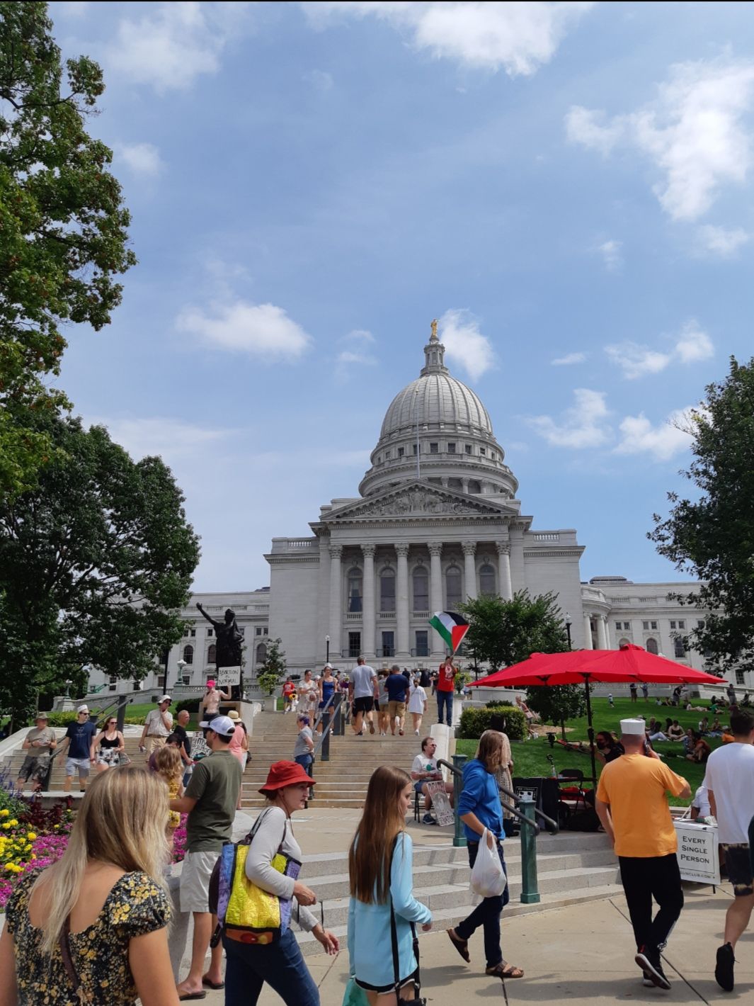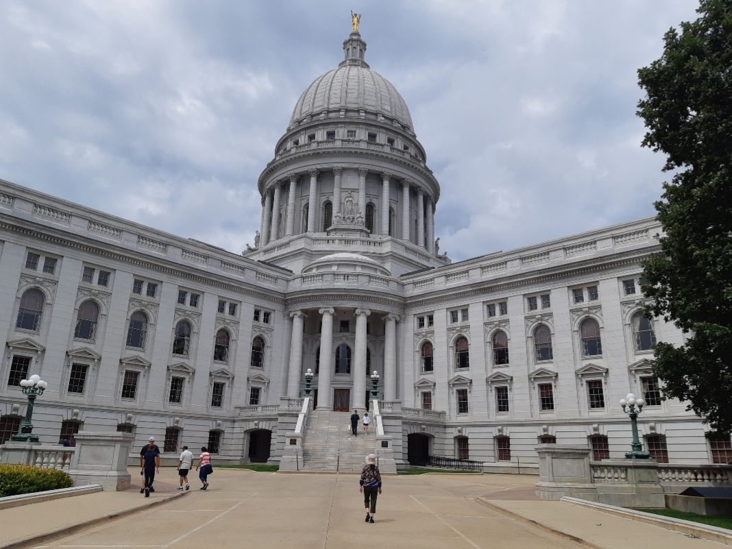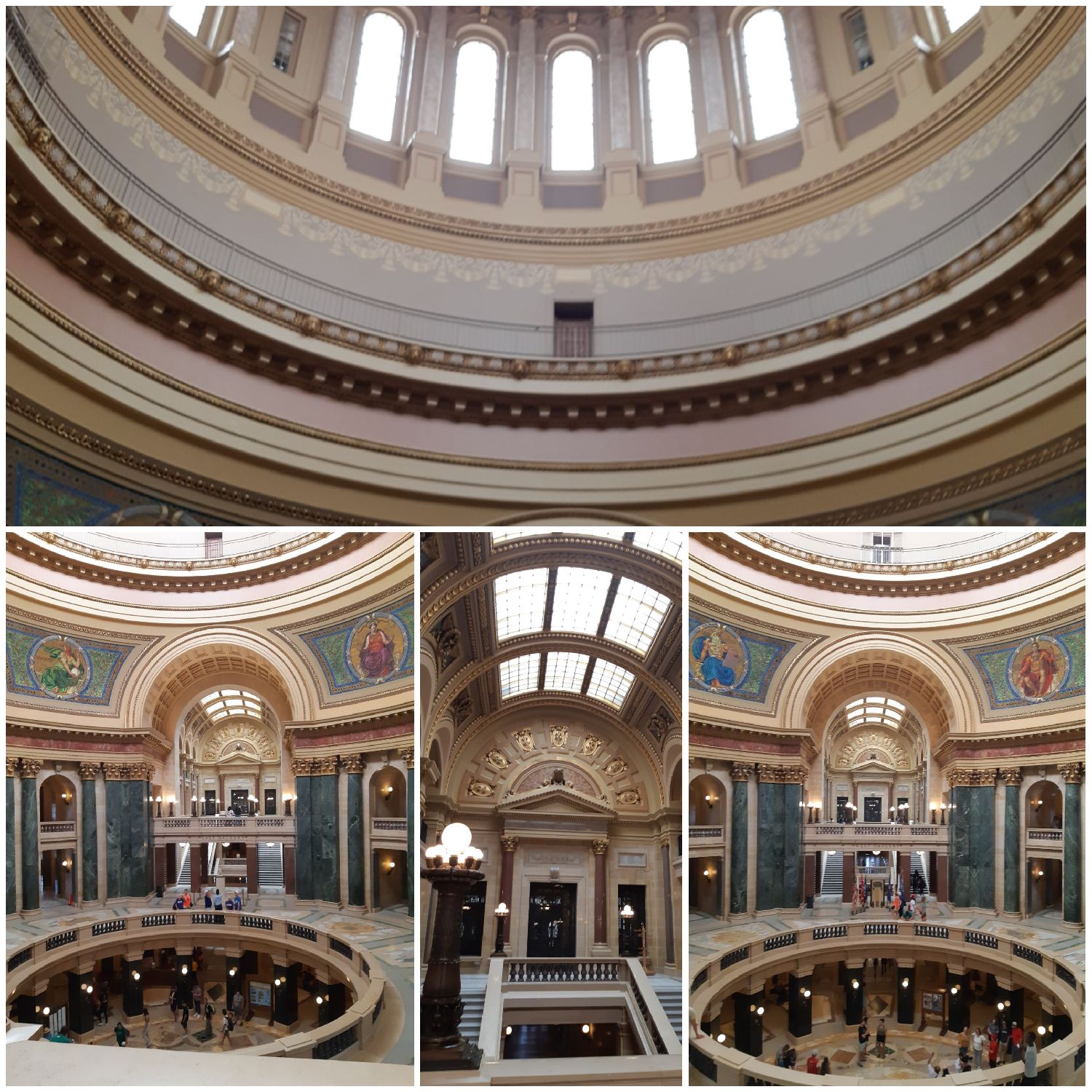 麦迪逊全市较少摩天大楼,原因是州的法律禁止市中心的建筑超过议会大厦。大厦建在市中心的小山丘上,居高临下俯瞰全市,十分引人注目。议会大厦与国会大厦很相似,它的圆顶高度仅次于国会大厦,据说是全美第二。议会大厦平日办公,周末可随意参观。忽见穿红色婚纱的新娘,西装新郎伴郎和盛装的伴娘拾级而上,大概是拍婚纱照。大厦是全城最高建筑,州长办公室、州最高法院也在里面。大理石廊柱,雕塑、浮雕处处,华美、精致、庄重。议会大厦穹顶100%采用花岗石,据说是世界上同类建筑结构中最大的。圆形穹顶四周,有Liberty,Justice,Legislation,Government(自由,立法,司法,行政)四幅巨幅壁画,这是美国的立国之本。