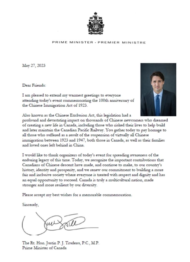 加拿大联邦总理特鲁多也为本次活动发来了贺信,他在贺信中表示:“1923年通过的《排华法案》,对成千上万梦想在加拿大创造新生活的华人移民产生了深远而毁灭性的影响。