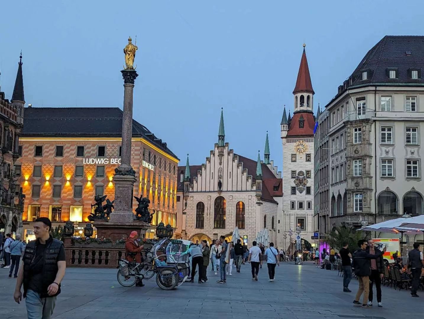 玛丽亚广场,这个慕尼黑的第一游客打卡点,真不负虚名。傍晚漫步充满人间烟火气的玛丽亚广场,