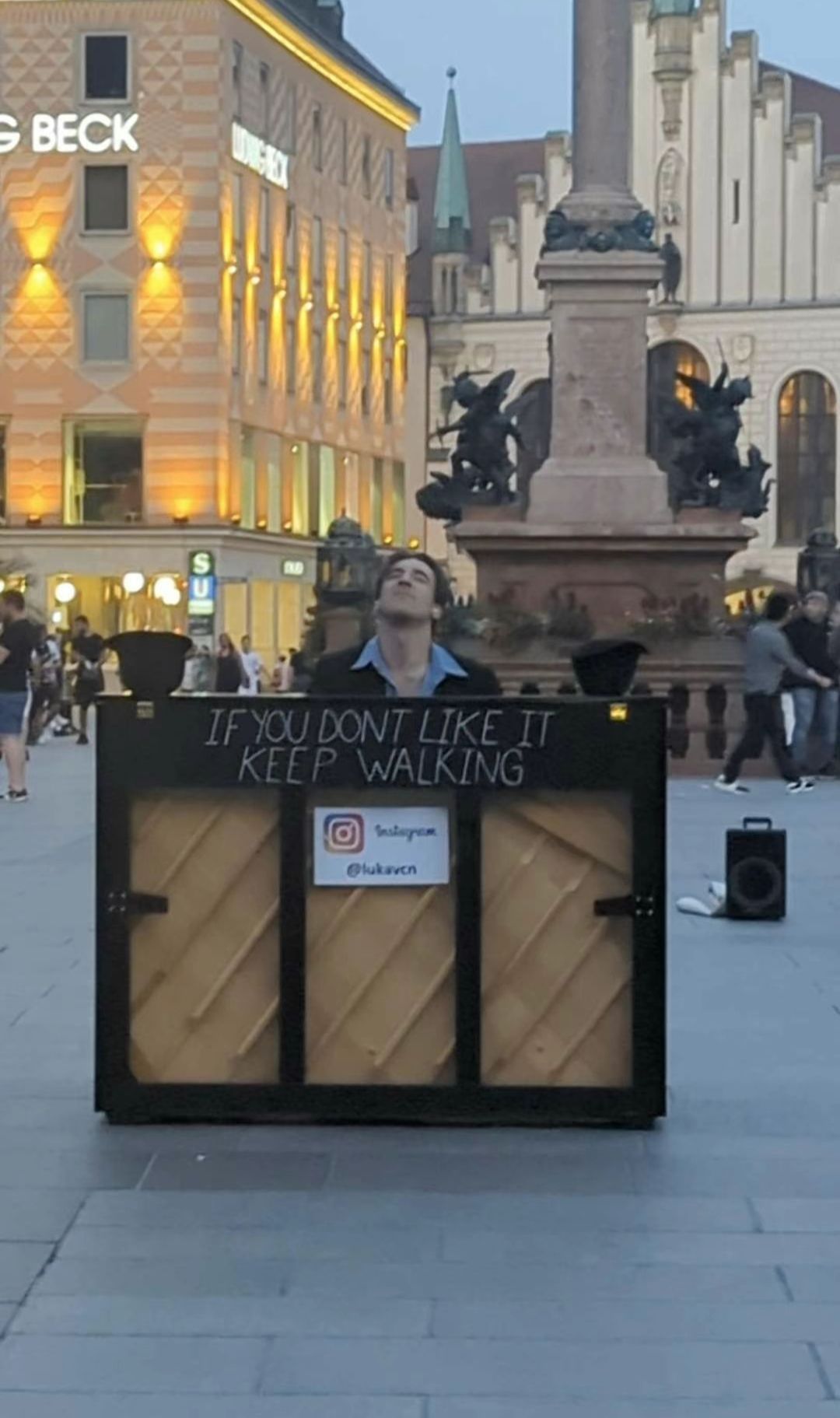 这是一位看起来非常自信的钢琴家。钢琴上写的是“if you don't like it, keeping walking(如果你不喜欢我弹的曲,请有多远走多远”!