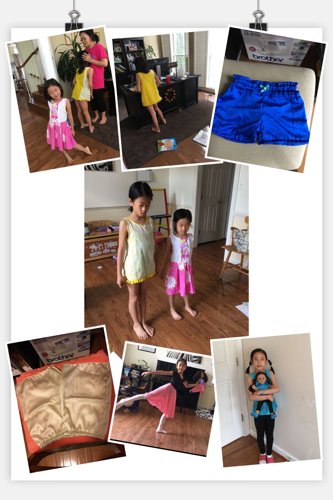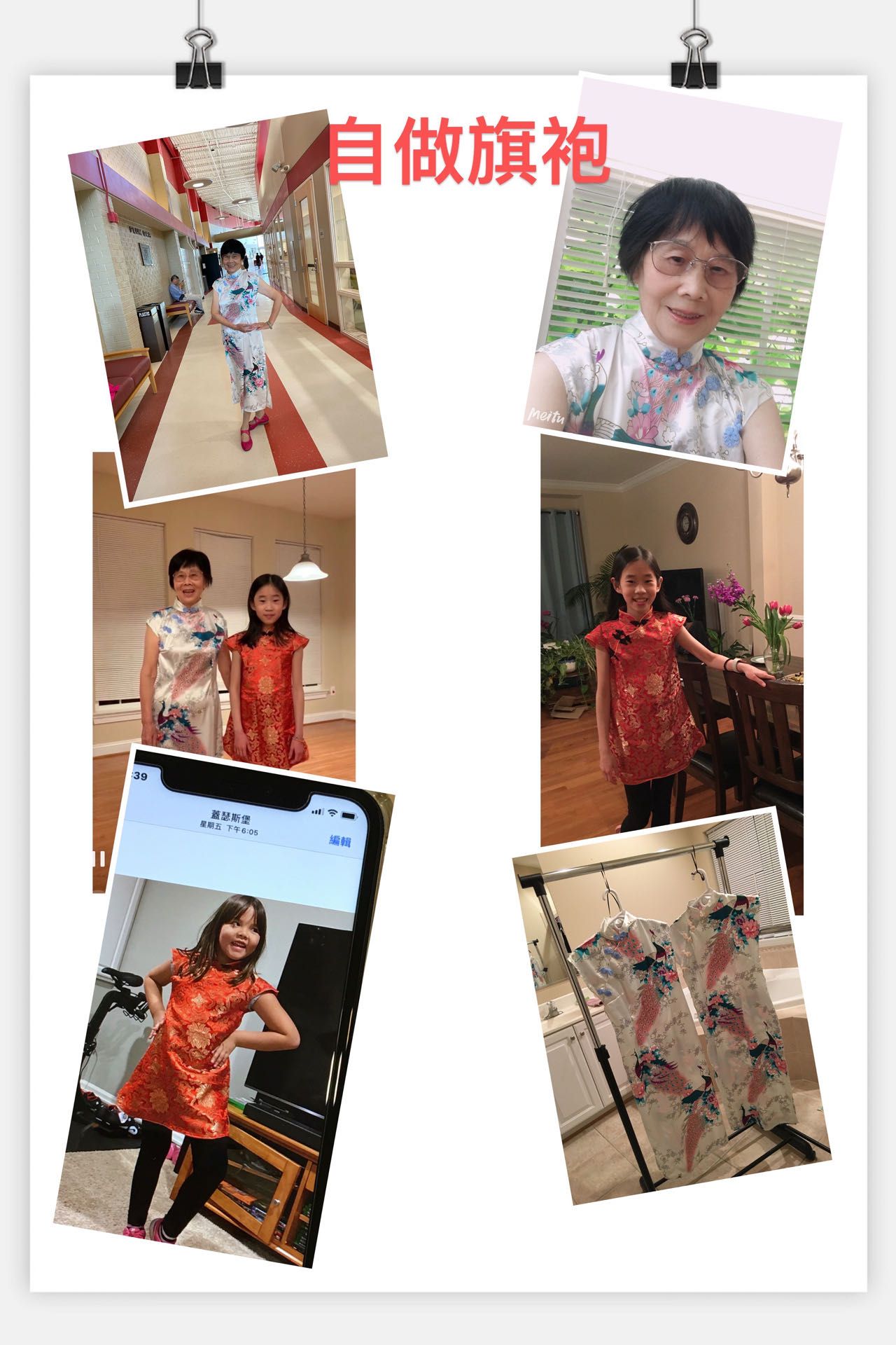 2008年,儿媳给我买了台电动缝纫机,小巧玲珑。英文盲的我,看不懂英文说明书,看示意图,竟然明白了锁边、绣花、锁扣等功能。找出两个新布枕套,给两个孙女每人做一件连衣裙。孙女们异口同声地说:摄像,摄像,摄下大孙女编舞,小孙女跟着学的美妙舞姿。师范同学妹看我还是那么怜惜,送来一大包中国真丝绸缎。我给孙女做短裤、裙子和睡衣。小孙女说奶奶给布娃娃做一套与我一样的衣裙,她快乐地抱着服饰与自己一样的布娃娃,拍下可爱的照片。有个台湾奶奶拿来⼀块红绸缎子,让给她外孙女做中式小旗袍,我精确摆裁,还给自己的小孙女也做了一件。一个小混血儿,大大的眼,卷卷的发,小洋妞穿上中式旗袍,显然多么可爱快乐。曾经两个大年初一,小孙女都穿着中式旗袍展示自己,如今已穿不下,但还珍藏着。