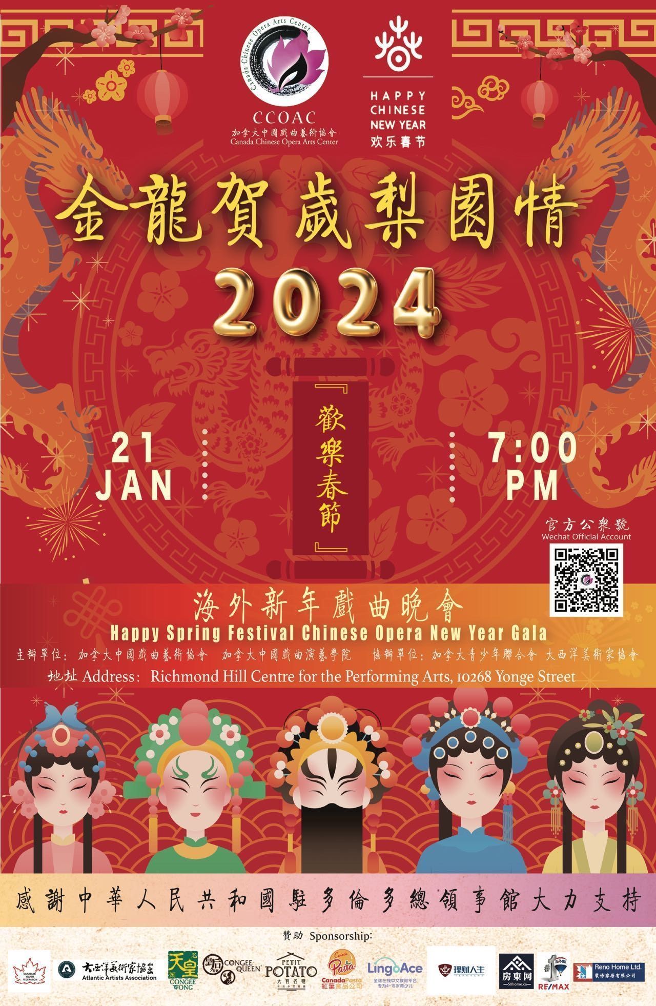 主题为“金龙贺岁梨园情”、第九届加拿大中国戏曲艺术协会2024“欢乐春节”海外新年戏曲晚会于元月二十一号晚(腊月十一)在大多伦多列治文山大剧院(Richmond Hill Centre for the Preforming Arts)成功举办。