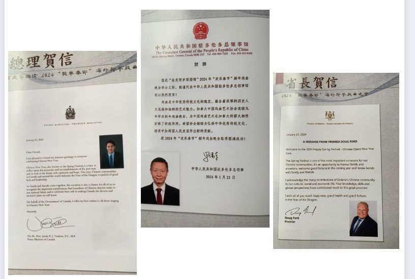 本台戏曲春晚收到加拿大总理Justin Trudeau、中华人民共和国驻多伦多总领事罗伟东,和安大略省省长Doug Ford发送的贺信。