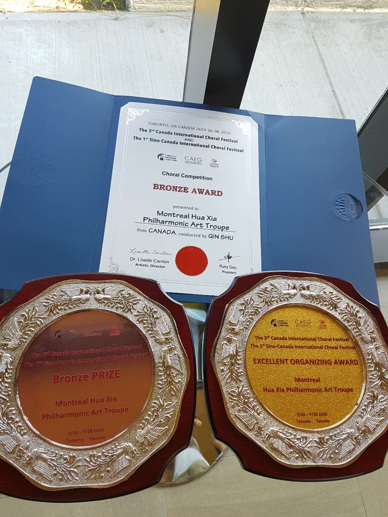 2019年指挥蒙特利尔华夏艺术团夺得多伦多国际合唱节铜奖。