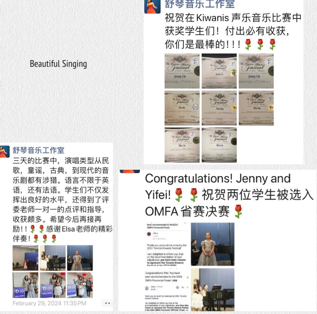 2024年她的多名学生在Kiwanis声乐比赛中取得好成绩,并进入安省音乐比赛决赛。