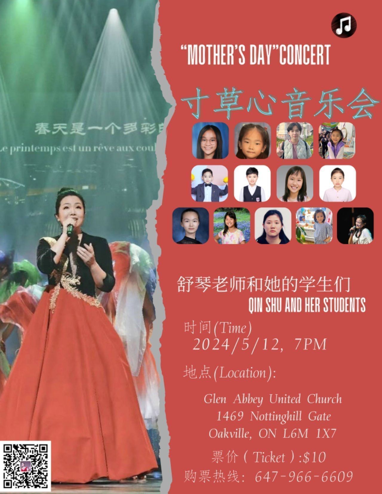 献给母亲的歌 ---- 舒琴老师和她的学生们的《寸草心音乐会》(“Mother’s Day Concert“),将于母亲节当晚7点(5月12日星期天)在Glen Abbey United Church (Address: 1469 Nottinghill Gate, Oakville, ON L6M 1X7 ) 倾情上演。