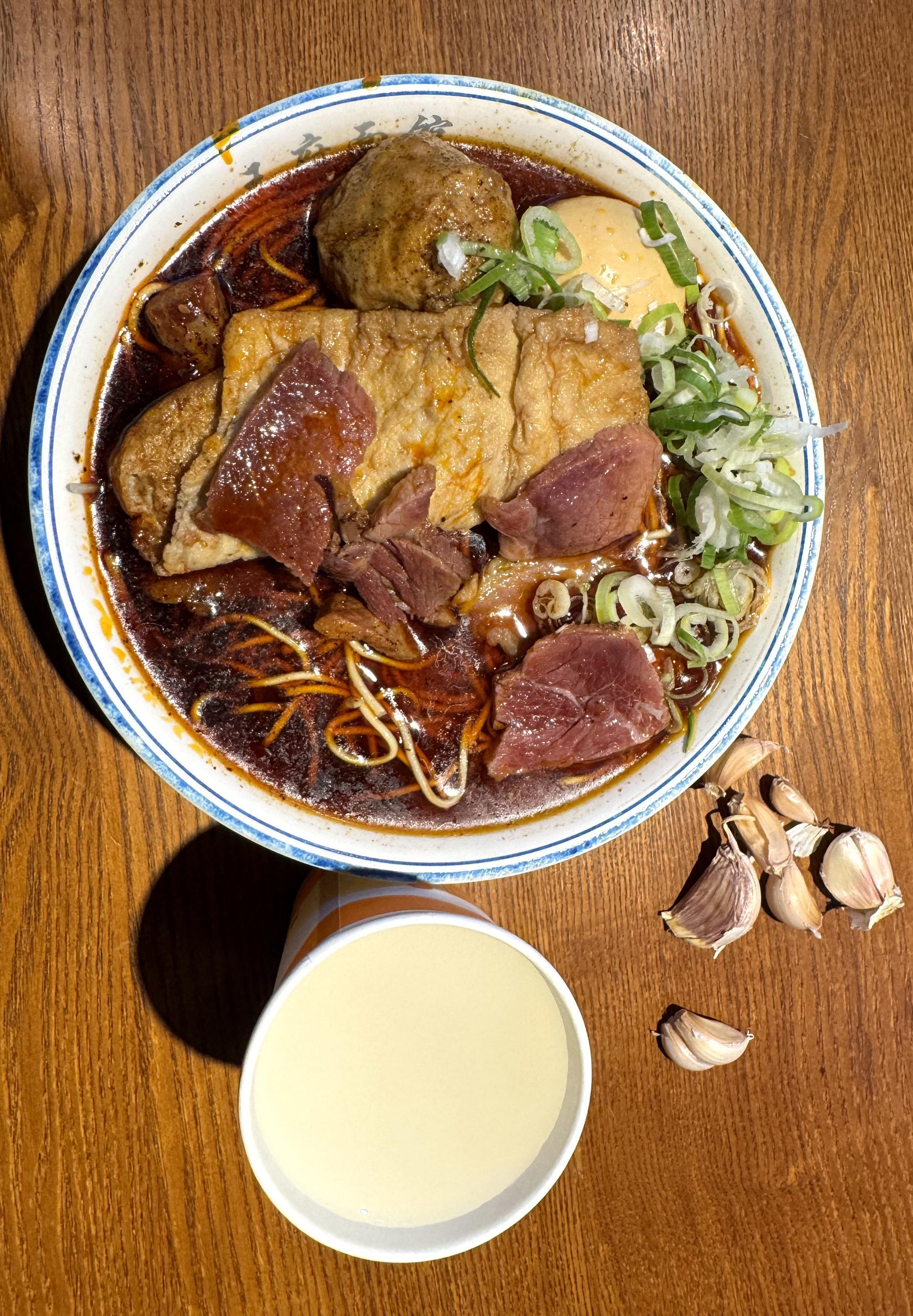 点了一碗牛肉面,16元,包括几大片牛肉;加一个鸡蛋一元、加一片豆腐一元、加一个丸子一元,不过这丸子是猪肉的,以淀粉为主;要了一杯黄酒,一元。