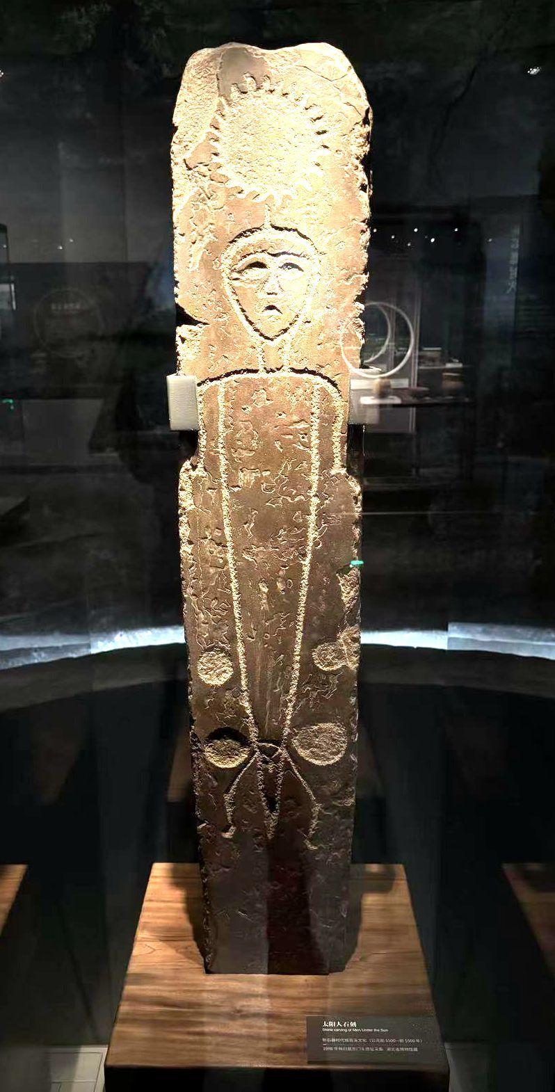 "太阳神纹石刻"是宜昌博物馆的镇馆之宝之一,1998年于宜昌秭归县东门头出土,距今约7000年,一个人,头顶光芒四射的太阳。