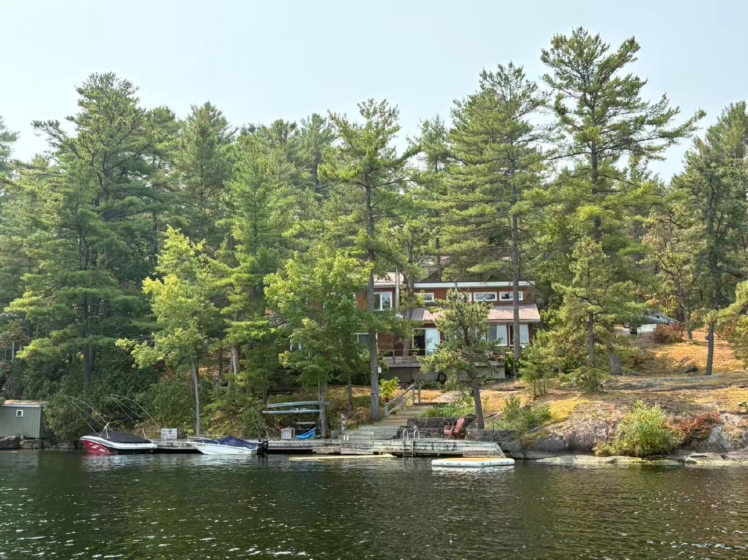 朋友的度假屋位于安大略省中部的一个大湖边,紧靠水滩,是一座两层别墅,楼上有三个房间,楼下是厨房,餐厅和客厅,有两个全套厕所。朋友是十多年前买的这个房子,经过他们夫妇自己动手对其全面翻修之后,焕然一新,前院和屋旁建起了木头阳台,水里建了几个浮桥,加上添置了包括游艇等等之类的水上设备,使这个度假屋增添了光彩。