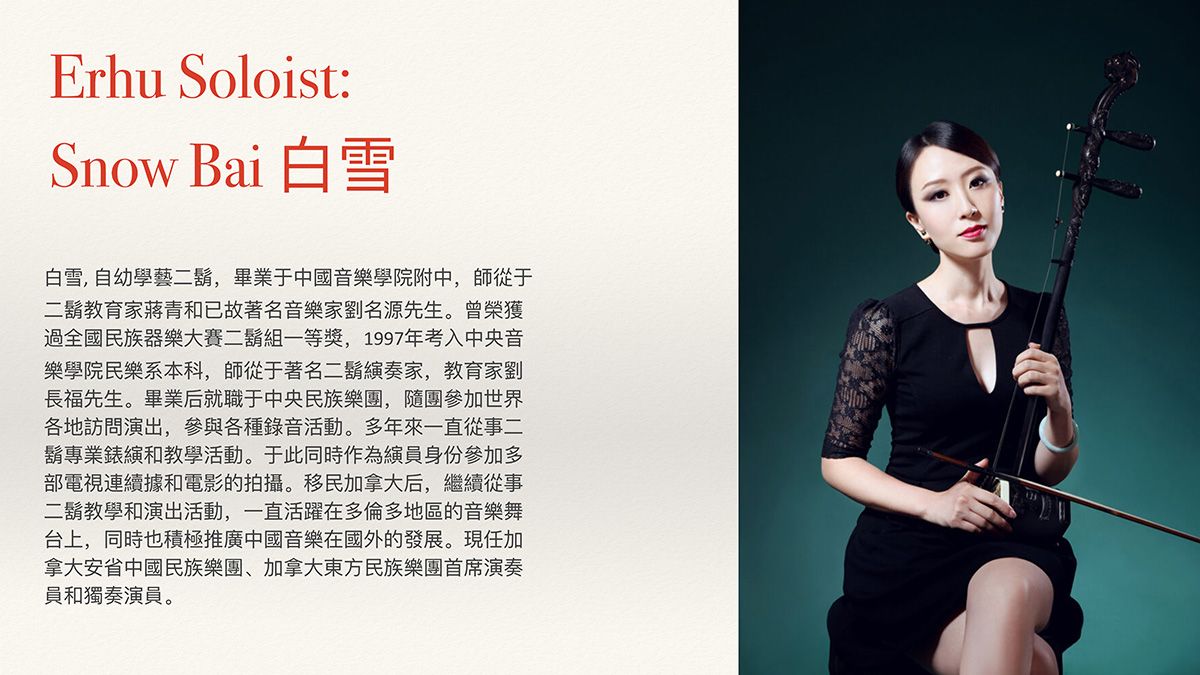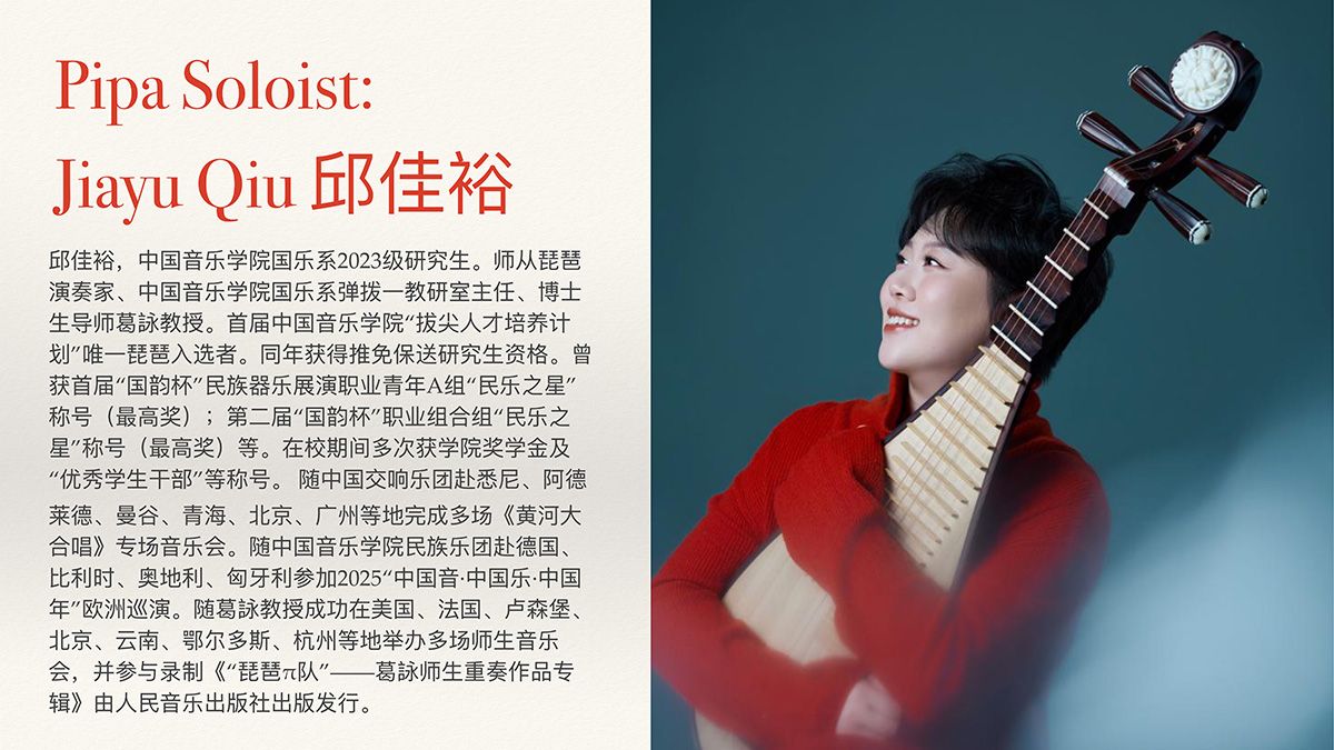•《霸王卸甲》琵琶协奏曲(周龙改编自楚汉古曲),演奏者:邱佳裕(中国音乐学院派驻,国际屡获奖项的琵琶青年演奏家)古战场战马奔腾之声,以琵琶与交响融合呈现历史恢宏气象。