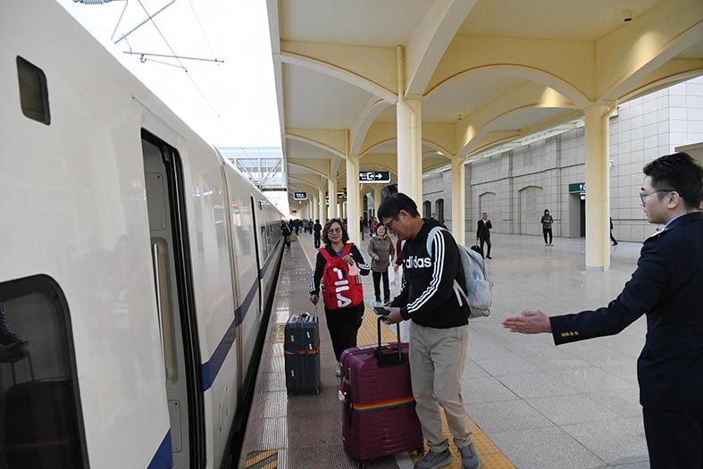 27日,韦家胜和妻子阮雪花在车站工作人员的引导下登上首发列车。(图片来源:中新社)