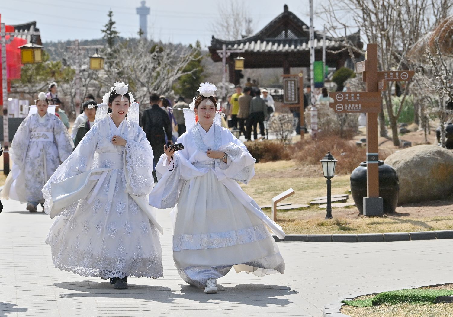 4月7日,在吉林省延边州延吉市的中国朝鲜族民俗园内,游客身着朝鲜族服饰游玩。延边是中国唯一的朝鲜族自治州和最大的朝鲜族聚居地,近年来延边旅游持续火爆,朝鲜族服饰旅拍也成为最受欢迎的旅游项目之一。(图片来源:中新社)