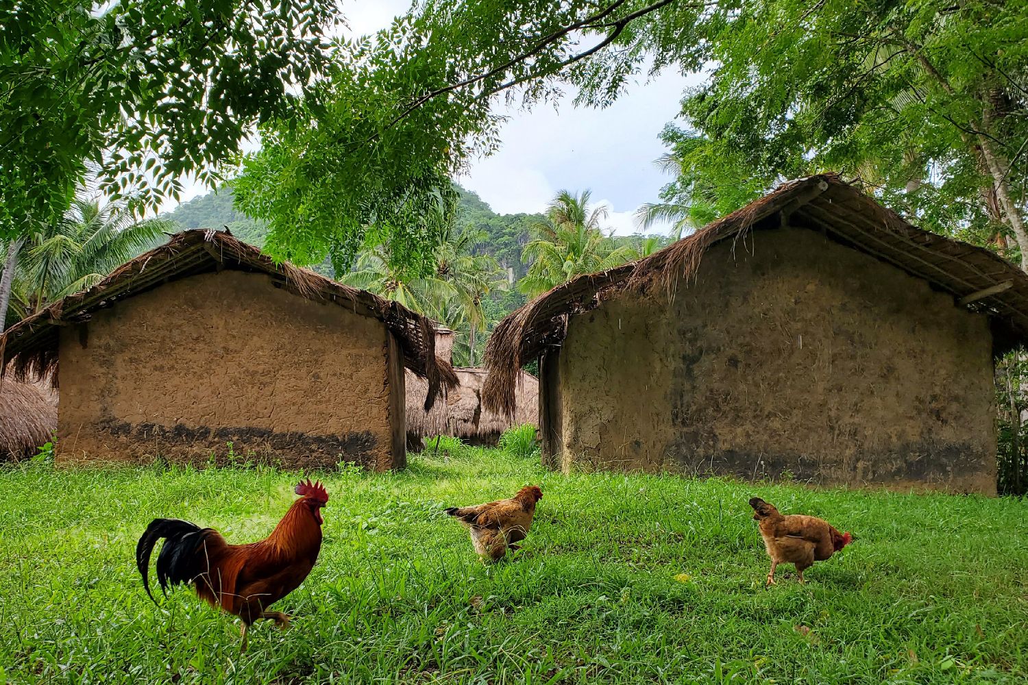 7月10日,家禽在白查村船型屋周边觅食。(图片来源:中新社)