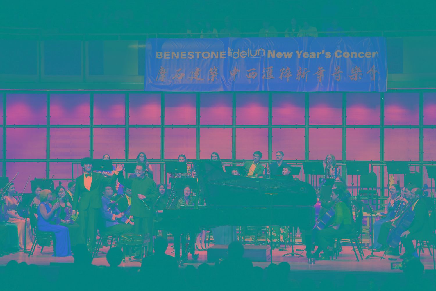 5日,加拿大华人音乐机构李德伦音乐基金会在多伦多举办2025“中西汇粹”新年音乐会。中国著名指挥家谭利华为该音乐会执棒,与多伦多节日交响乐团及来自世界各地的多位音乐家合作,为乐迷奉献精彩的音乐盛宴。图为谭利华与17岁的加拿大华裔钢琴才子王帅文(Ryan Wang)携手向观众致意。(图片来源:中新社)