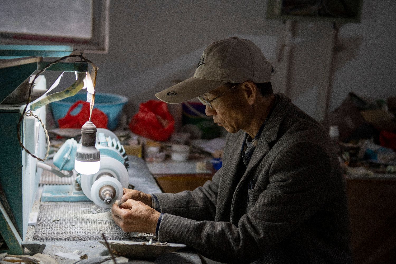 2月3日,广西北海,林日光将贝壳打磨成所需形状。(图片来源:中新社)