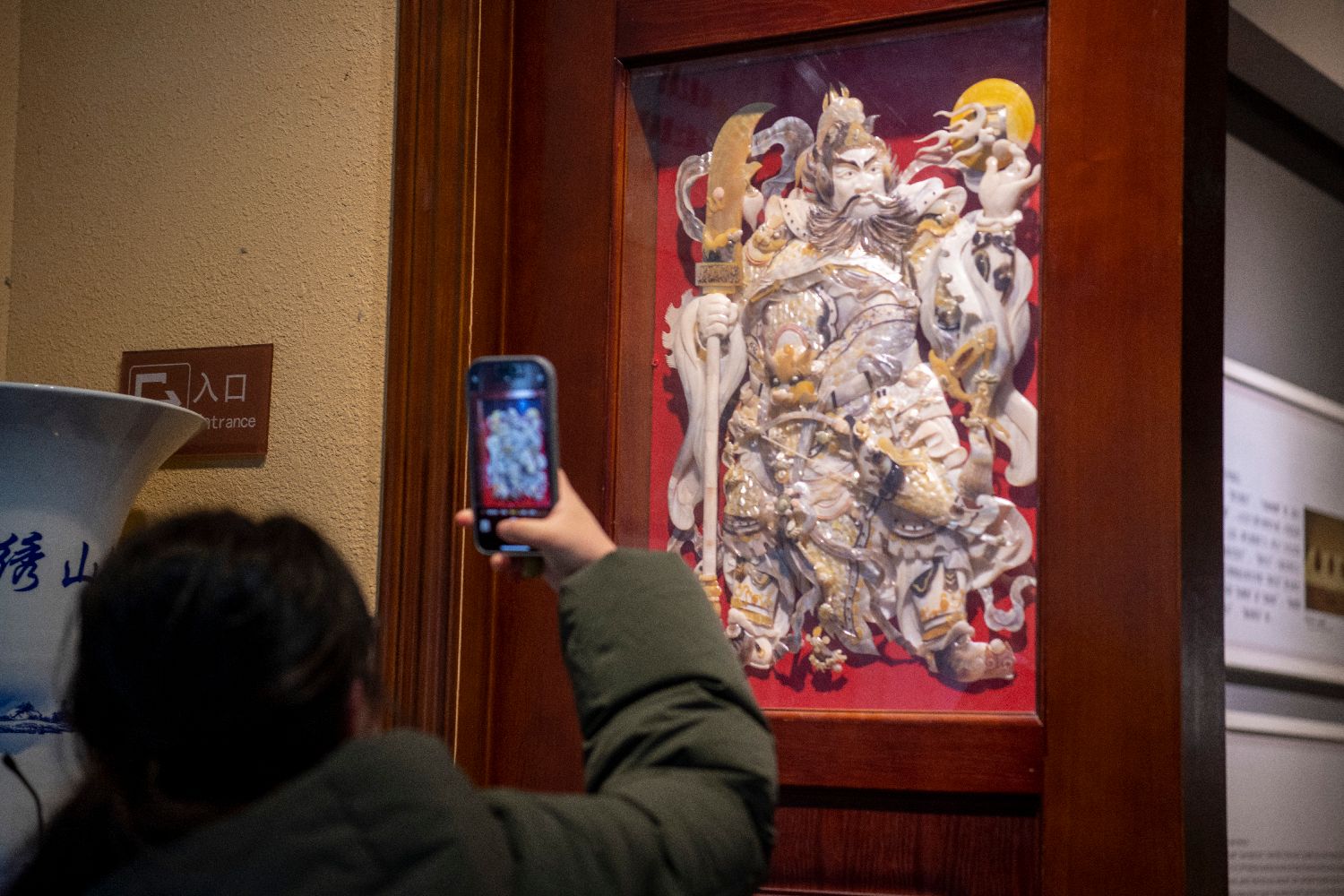 2月3日,游客在广西北海贝雕博物馆拍摄贝雕作品《日月门神》。(图片来源:中新社)