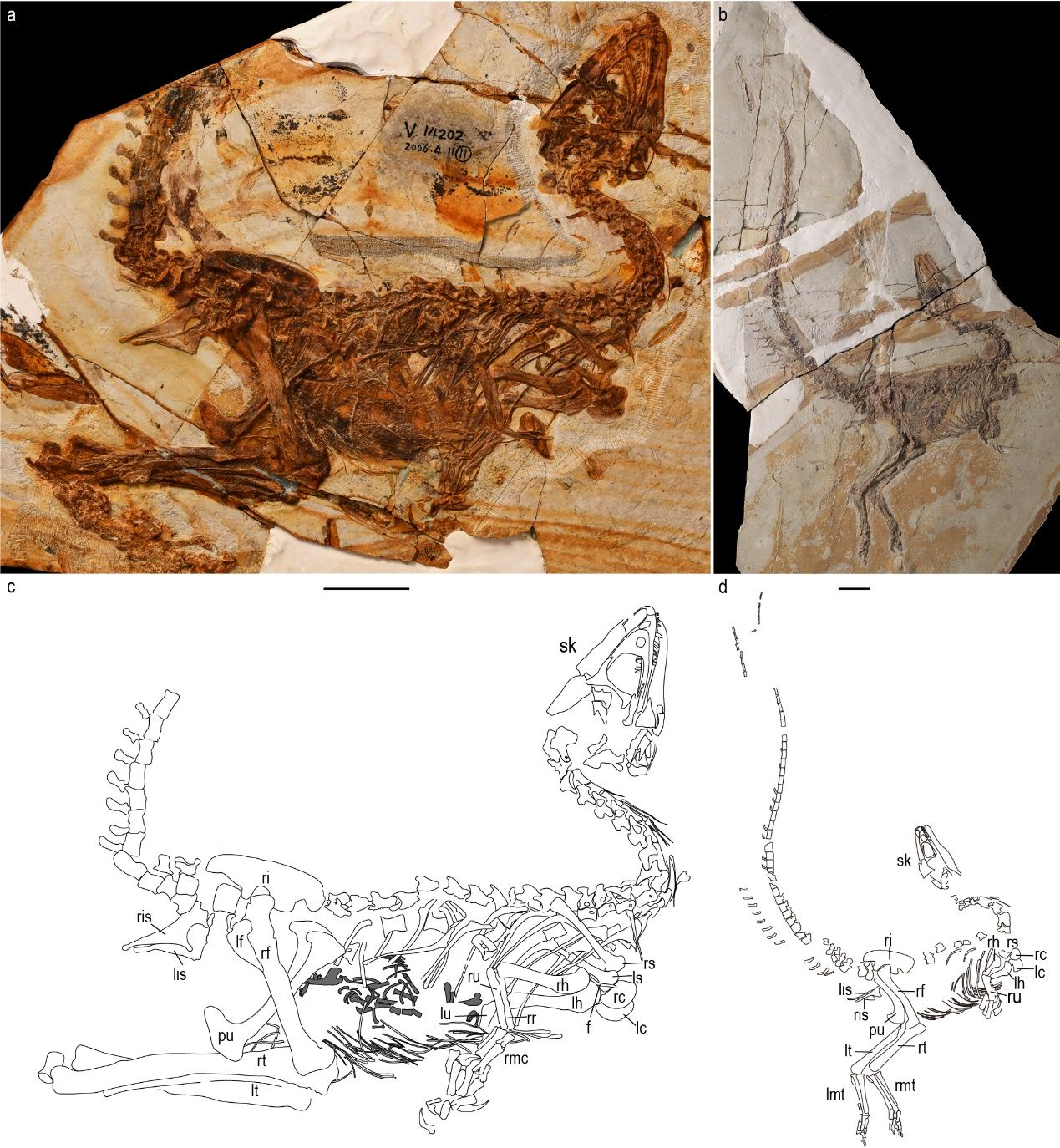 中国华诞龙(a,c)和凌源中华鸟龙(b,d)正型标本及线条图。(图片来源:中新社/中国科学院古脊椎所供图)