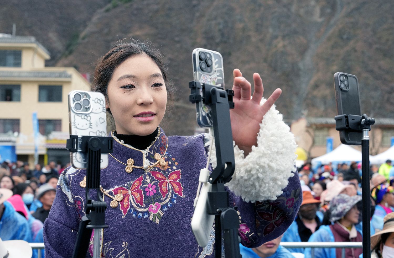 3月17日,四川省金川县,一位藏族姑娘正在直播马奈锅庄。(图片来源:中新社)
