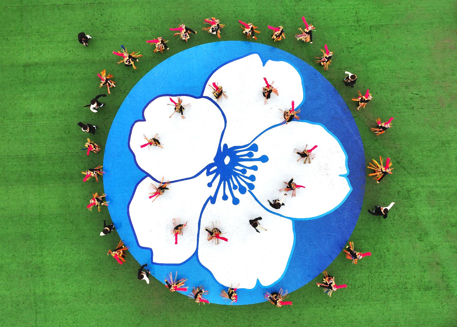 3月18日,金川县的锅庄队围着梨花图案跳锅庄。(图片来源:中新社)