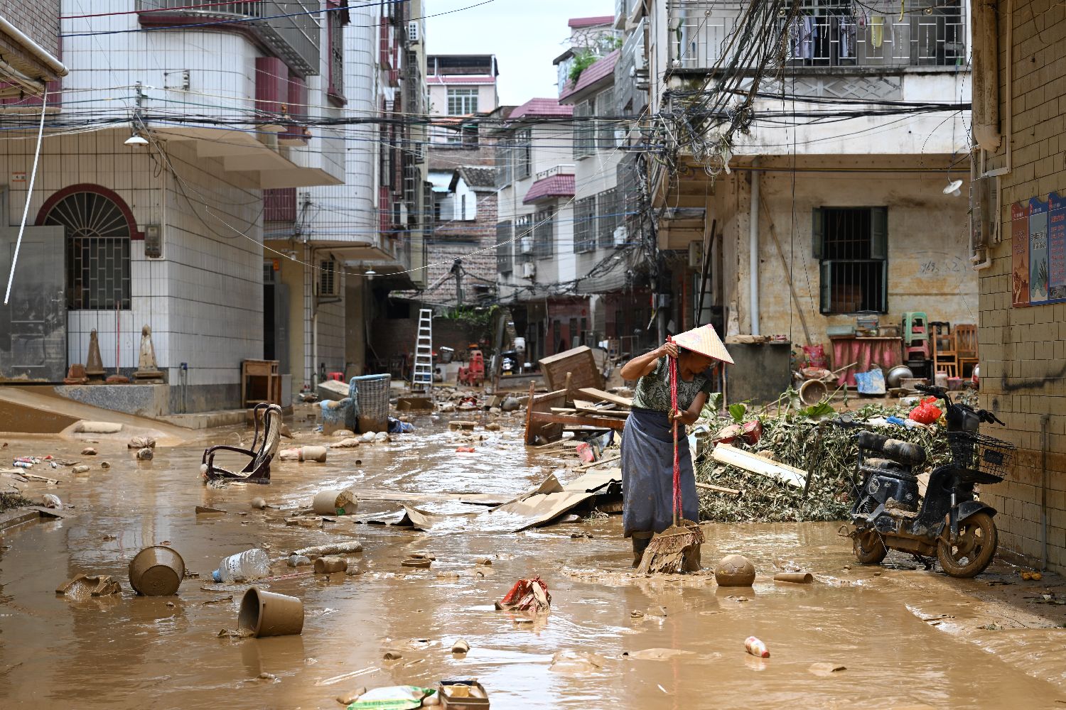 洪水退去后的怀集街头,路面、台阶、巷口都被淤泥覆盖。每一脚踩下去,淤泥都会黏附鞋子,最深处能接近膝盖。