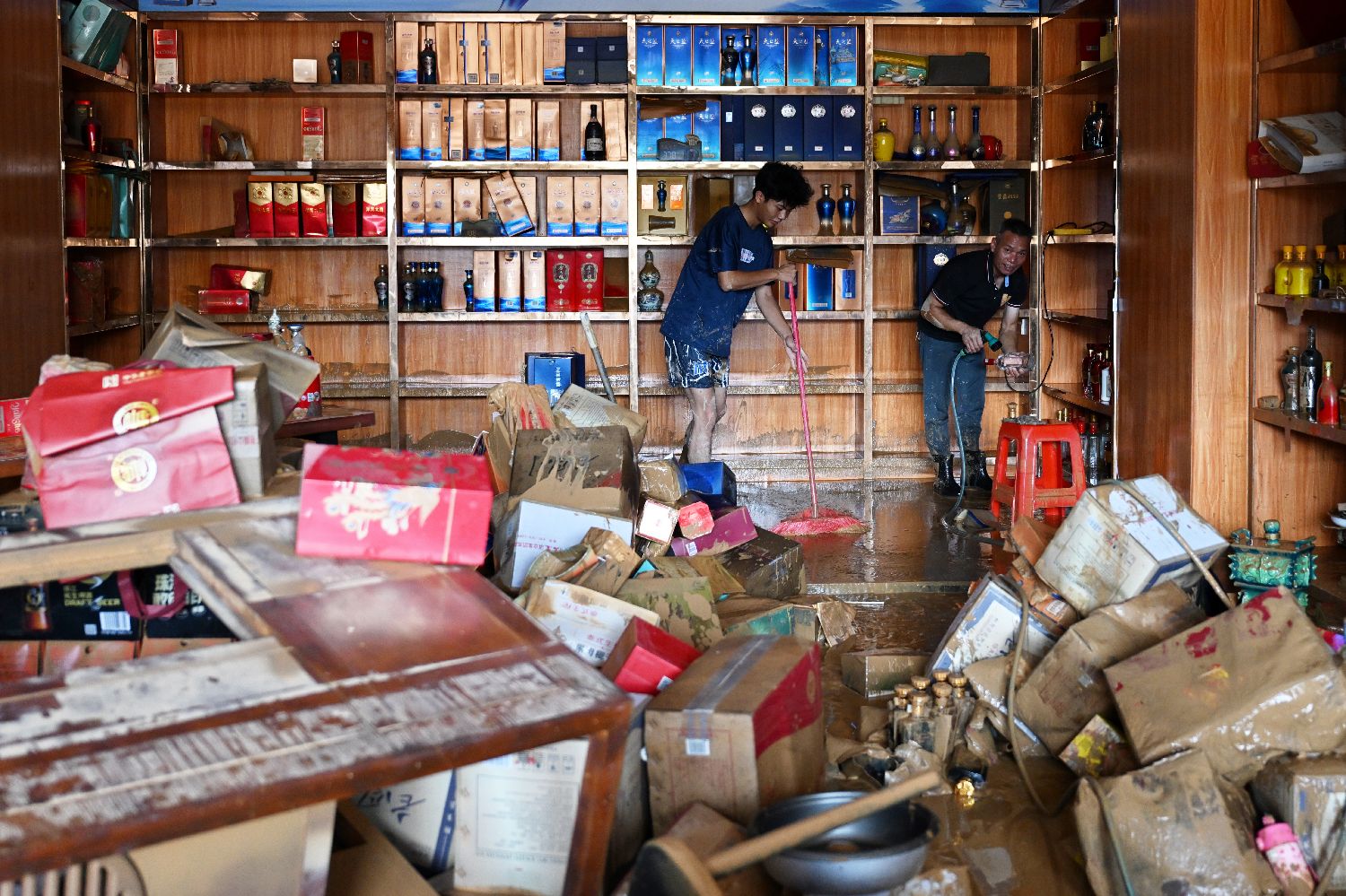 烟酒店店长古先生在擦拭着沾满黄泥的货架和墙面,他表示,此前提前接到政府的预警后,用卡车把大部分货物转移至高处,但是剩余留店货物遭浸泡。目前主要靠自己作业,志愿者也会帮忙清理门口淤泥。