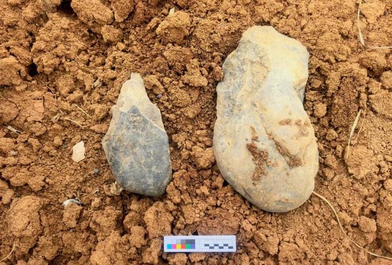 图为地表发现的手镐和薄刃斧。(图片来源:中新社资料图/陕西省文物局供图)