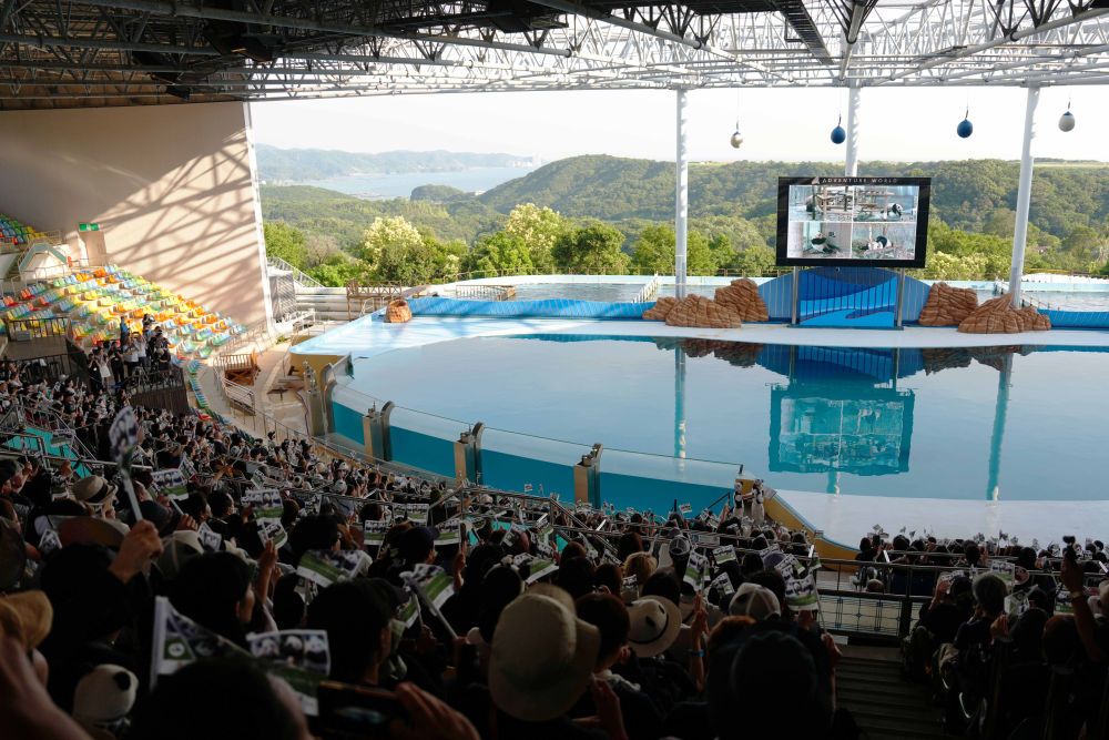 6月27日,在日本和歌山县,游客在白浜冒险世界游乐园内举行的欢送仪式上向四只旅日大熊猫挥手道别。(图片来源:新华社)
