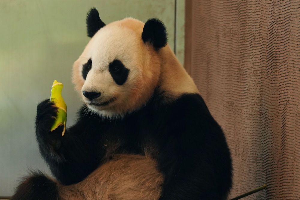6月27日,在日本和歌山县,旅日大熊猫枫浜在白浜冒险世界游乐园内进食。(图片来源:新华社)