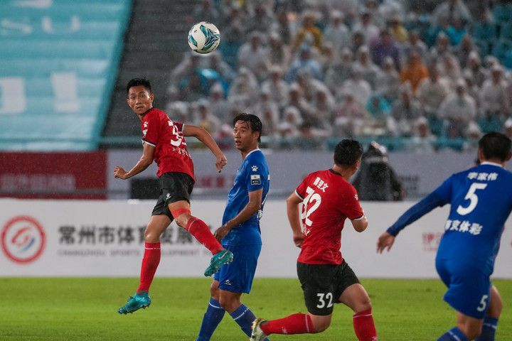 江苏各地市代表队的球员们,在“苏超”上为球迷们送上一场场精彩对决。图为6月21日,常州队主场对阵南京队。(图片来源:新华社)