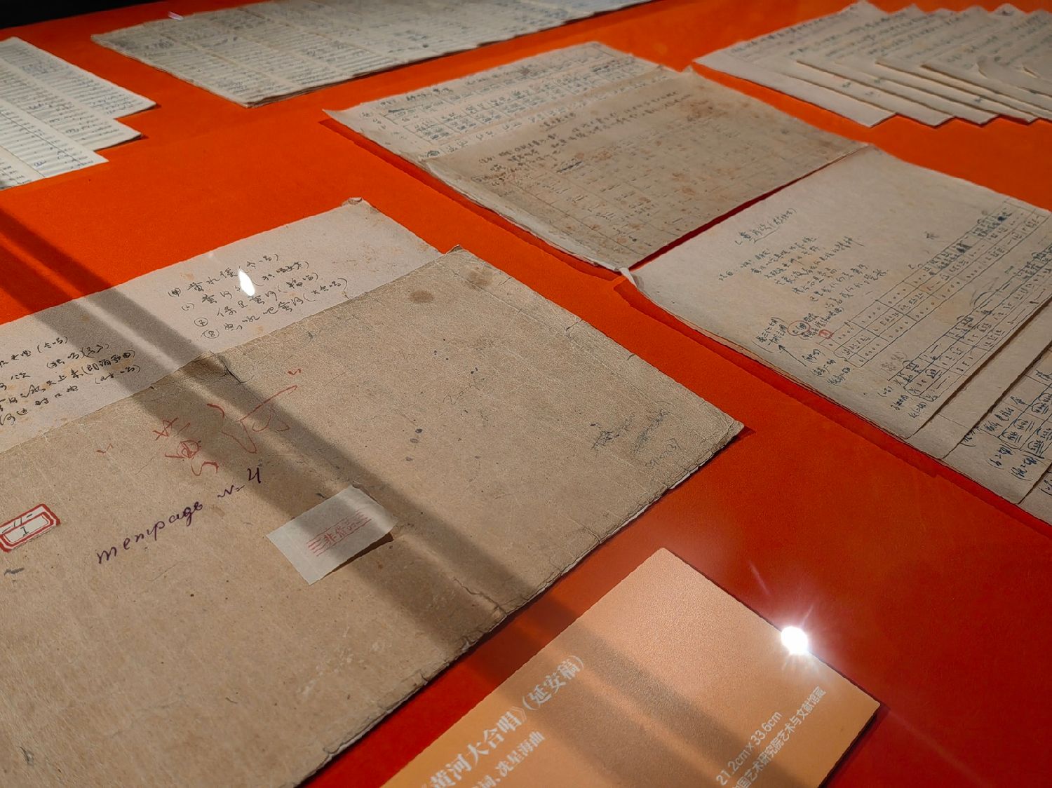 图为现场展出的冼星海《黄河大合唱》手稿的延安稿。(图片来源:中新社)