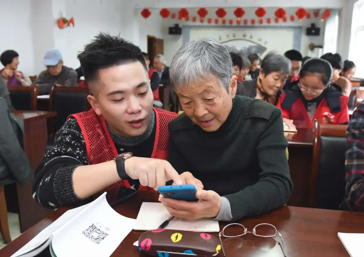 志愿者(左)在教浙江一社区居民使用智能手机。(图片来源:新华社资料图)