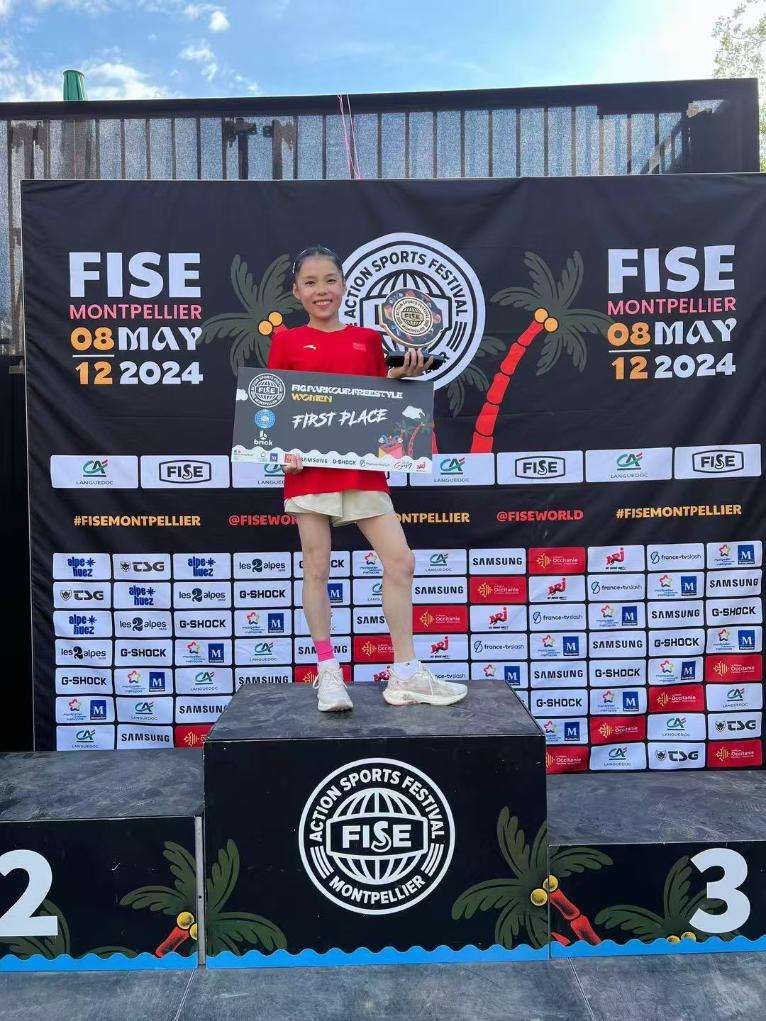 商春松在2024年跑酷世界杯蒙彼利埃站比赛中登上冠军领奖台。(图片来源:新华社)