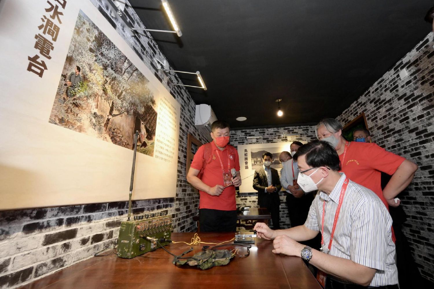 2022年9月3日,香港特区行政长官李家超(右一)出席香港沙头角抗战纪念馆揭幕典礼时,在纪念馆“石水涧电台”展区体验抗战时期电台工作。(资料图)(图片来源:中新社/香港特区政府新闻处供图)