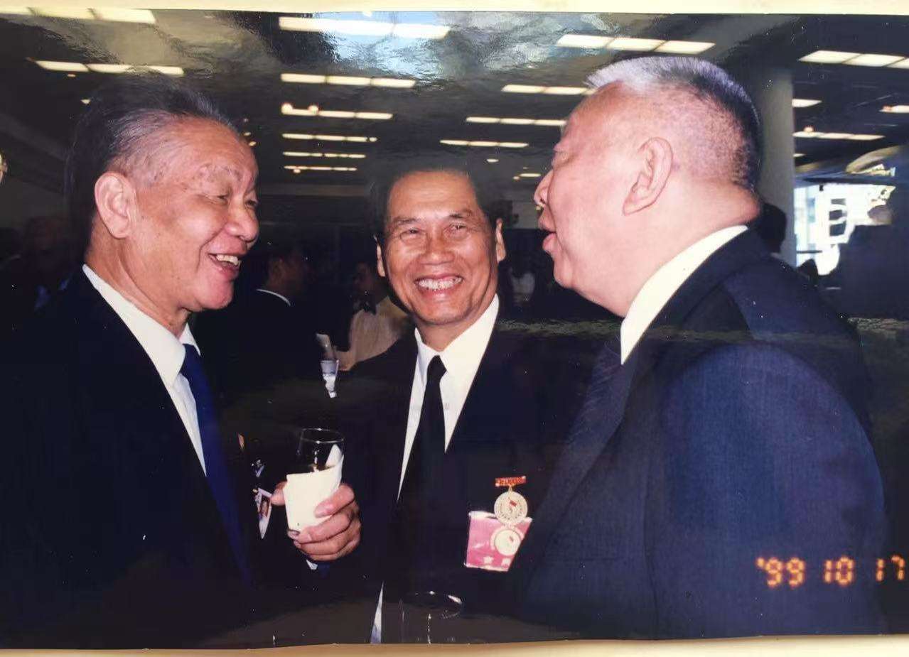 1999年10月17日重阳节当天,时任香港特区行政长官董建华(右一)、东江纵队港九独立大队老战士罗欧锋(中)和林鸣父亲、东江纵队港九独立大队老战士林传(左)畅谈。(资料图)(图片来源:中新社/受访者供图)
