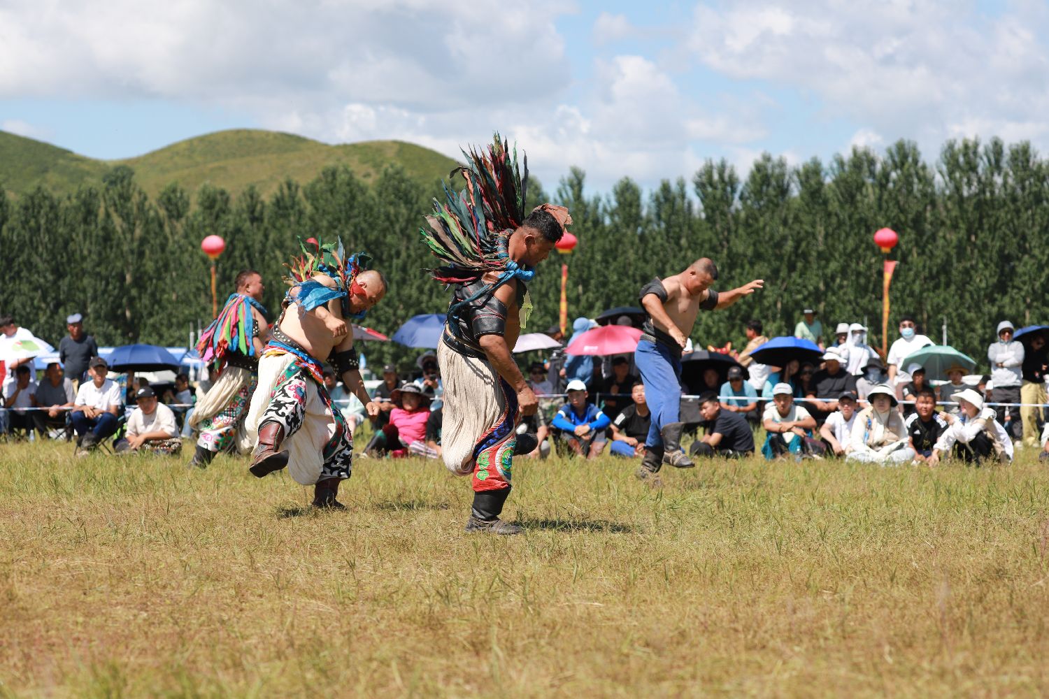 8月10日,兴安盟那达慕的成年男子搏克赛场上,搏克手们跳着模仿动物的舞蹈入场。(图片来源:中新社)