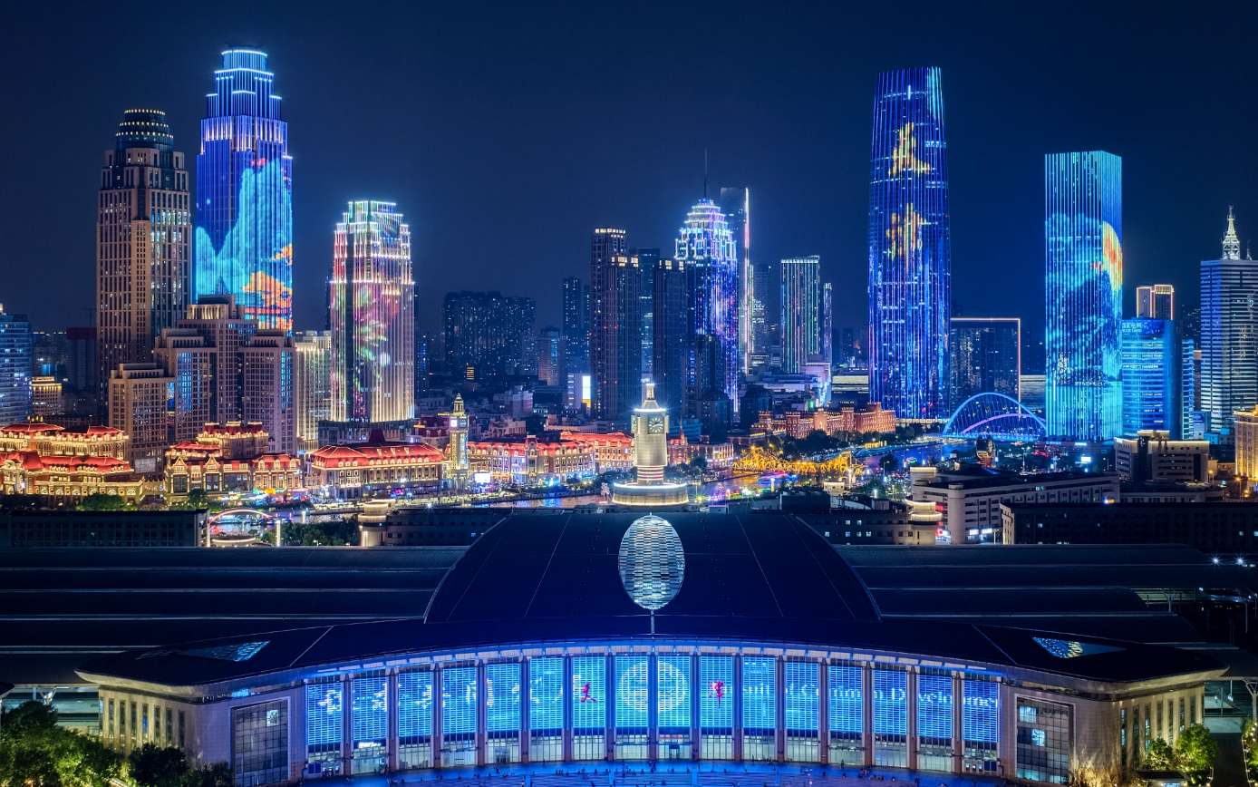 天津站海河夜景及楼宇主题灯光。(图片来源:中新社)