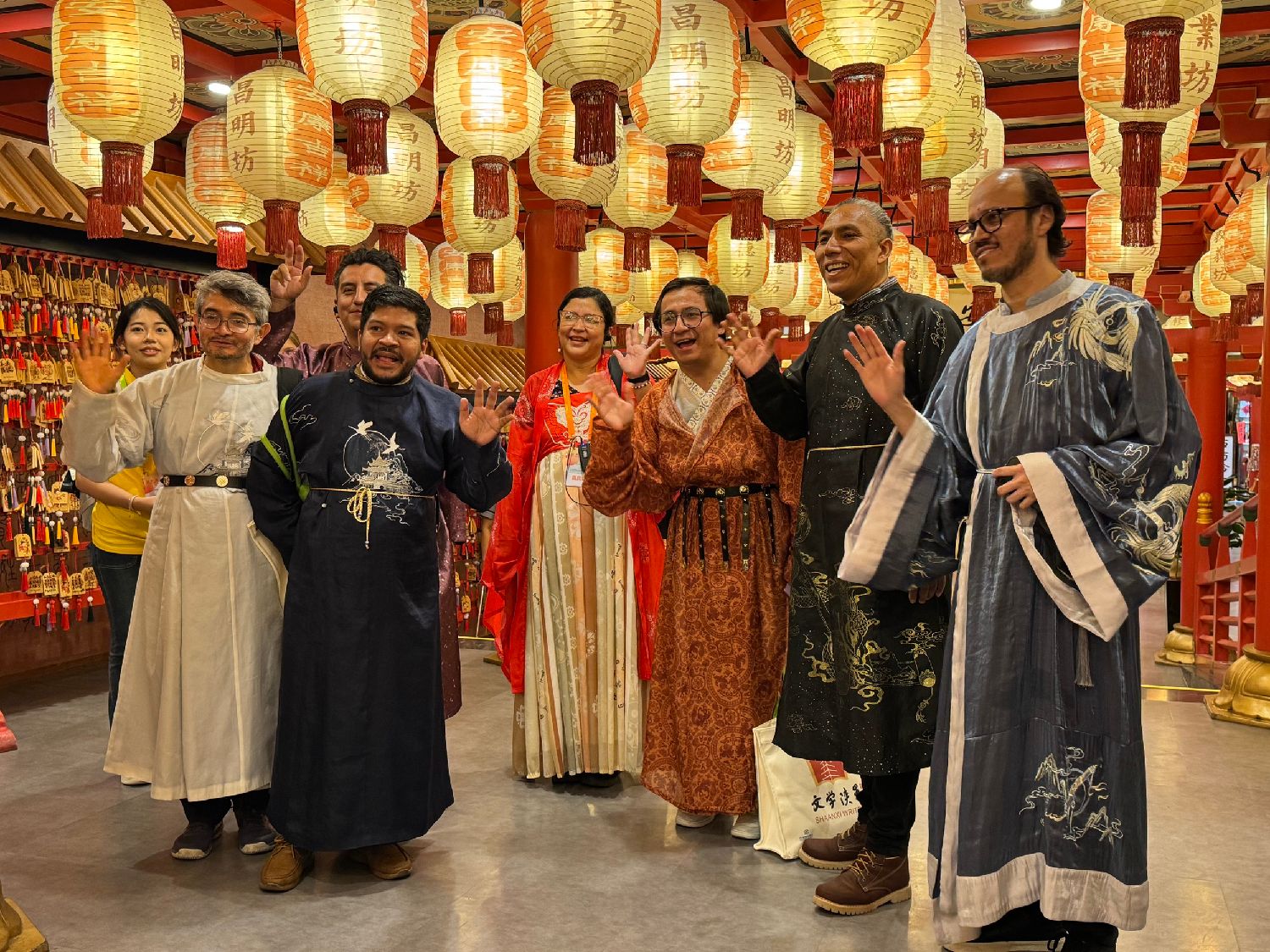 9月15日,拉美诗人身着汉服,在长安十二时辰主题街区合影留念。(图片来源:中新社)