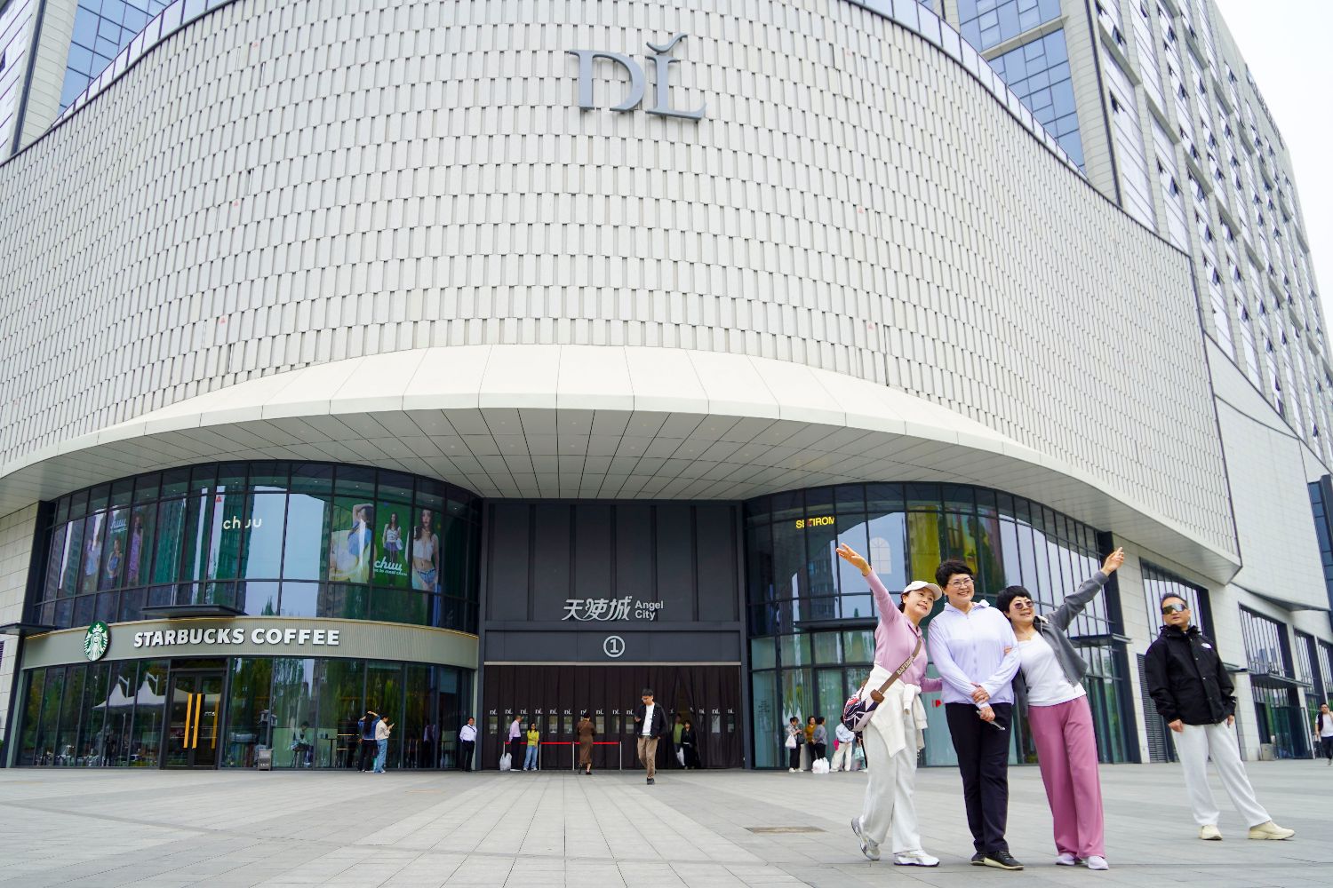 今年4月,河南省许昌市的胖东来超市天使城店门前,顾客拍照留念。(图片来源:中新社)