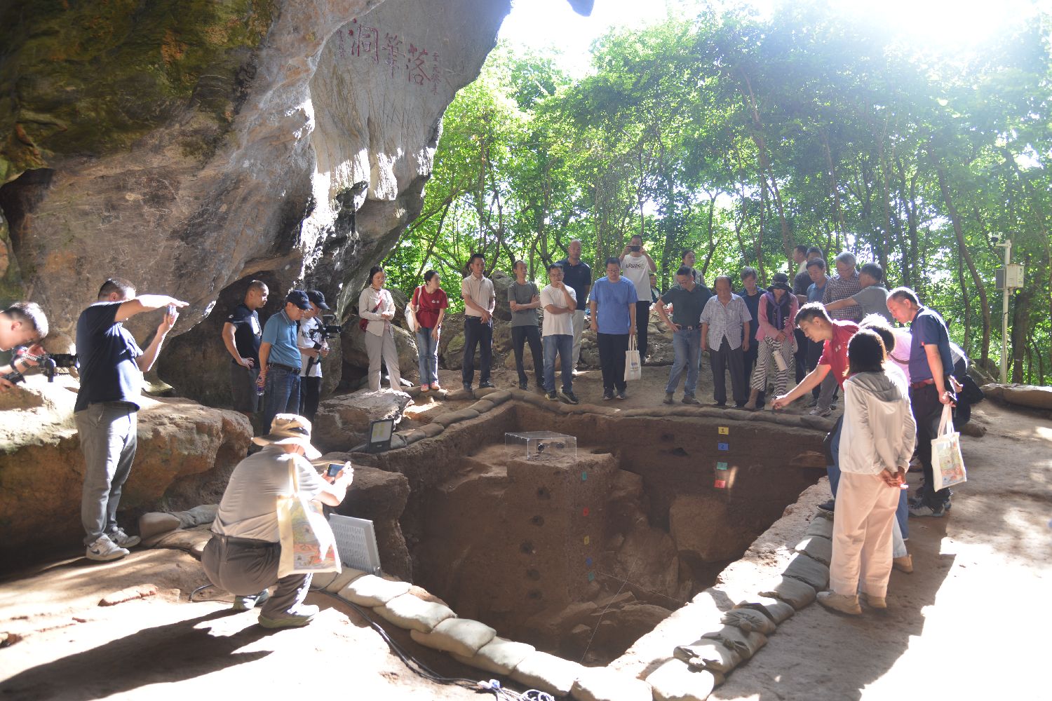 11月8日,来自中国各地的考古专家学者实地参观落笔洞遗址发掘现场。(图片来源:中新社)