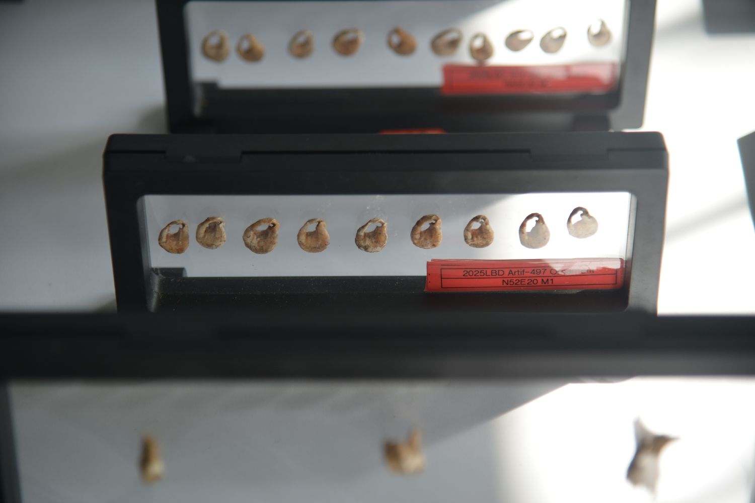 图为2025年度三亚落笔洞遗址联合考古发掘出的织纹螺贝饰标本。(图片来源:中新社)