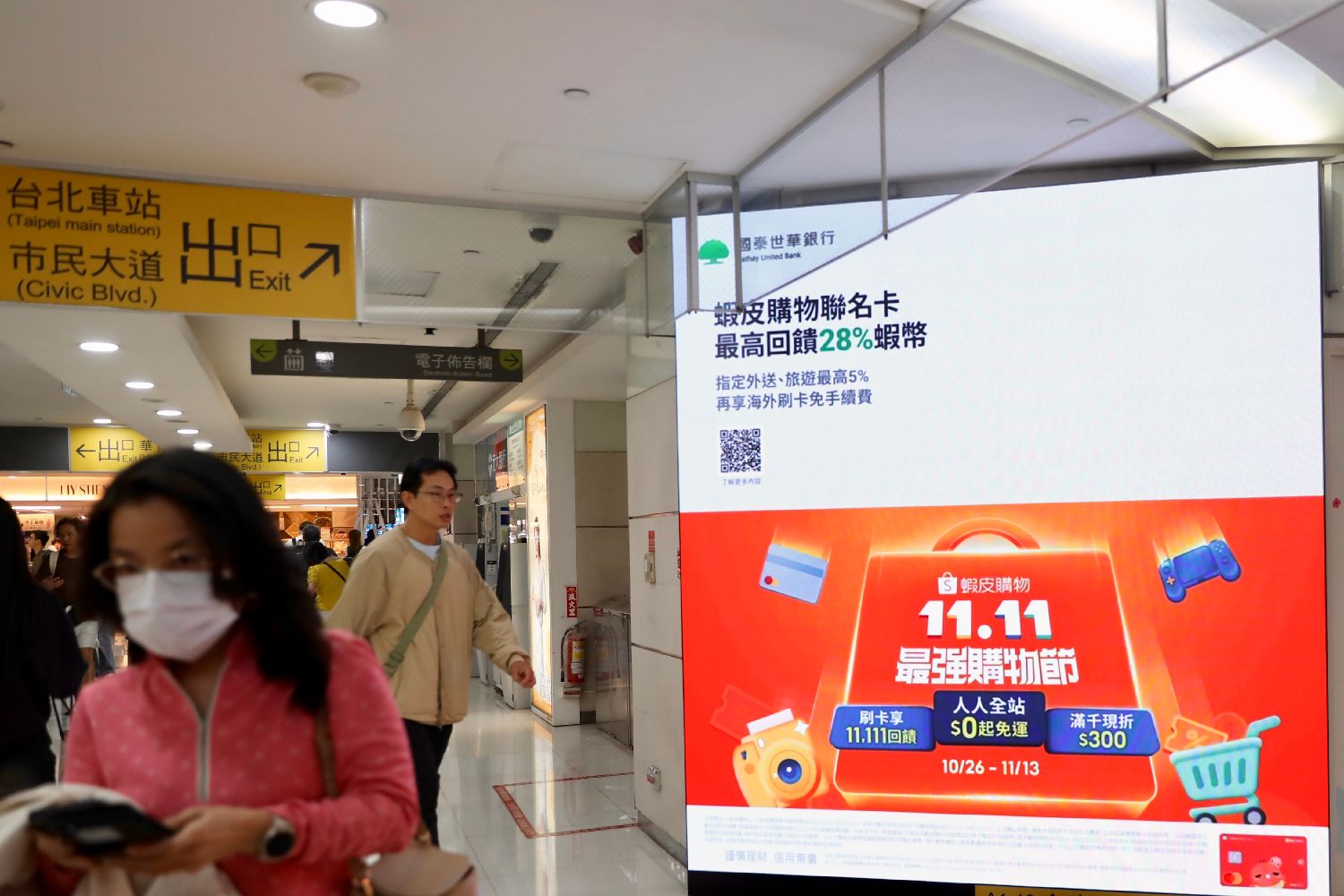 11月11日,“双十一”购物节在台湾带动消费热潮。图为台湾电商平台在台北一家商场的广告。(图片来源:中新社)